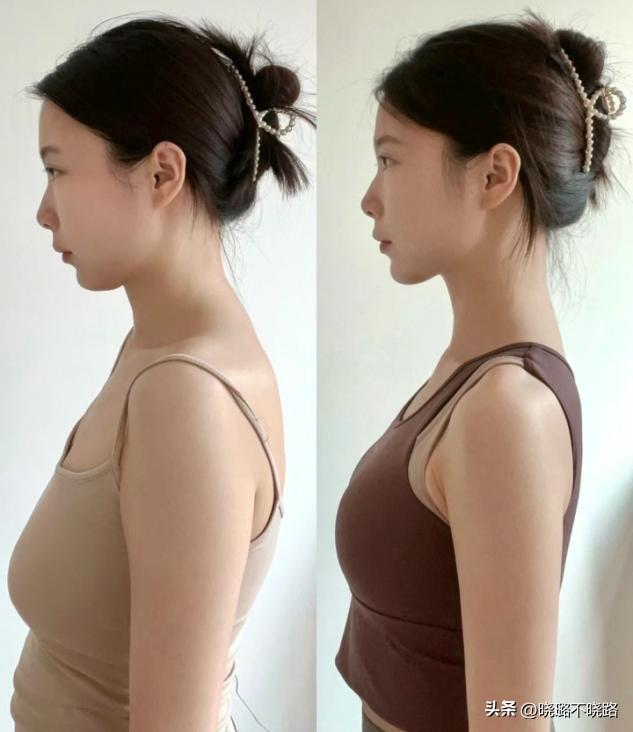 在視覺上看起來最影響體態的,還有頭肩比例的線條特點,如果說你有很明顯的駝背線條,像圖左一樣頭部向前傾斜,那麼就很容易突出背部的肩胛骨,看起來老態橫秋挺胸抬頭的視覺效果,讓下巴部分線條也有收縮,側面看起來更加精緻美麗。