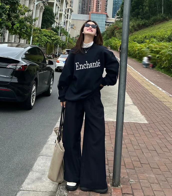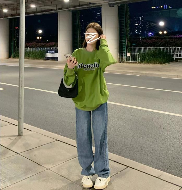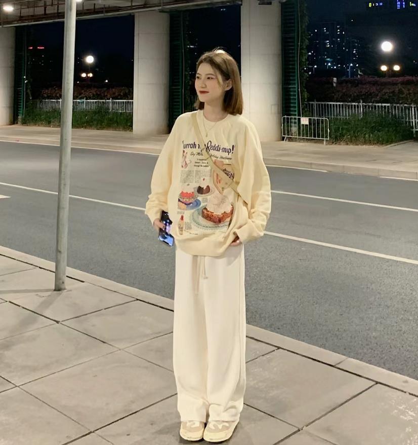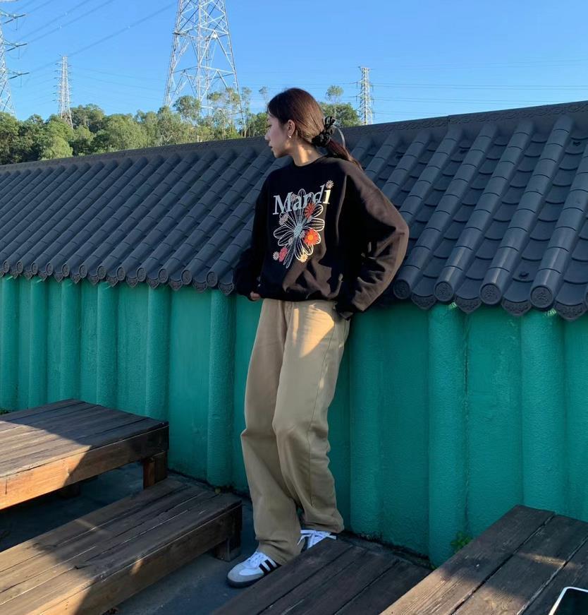 啊啊啊,奶杏色衛衣和米杏色的休閒拖地褲,真的是非常溫柔的配色呢,有種甜甜的韓系感覺。衛衣和褲子的版型都是那種寬鬆的,搭配一起,鬆弛感拉滿了。