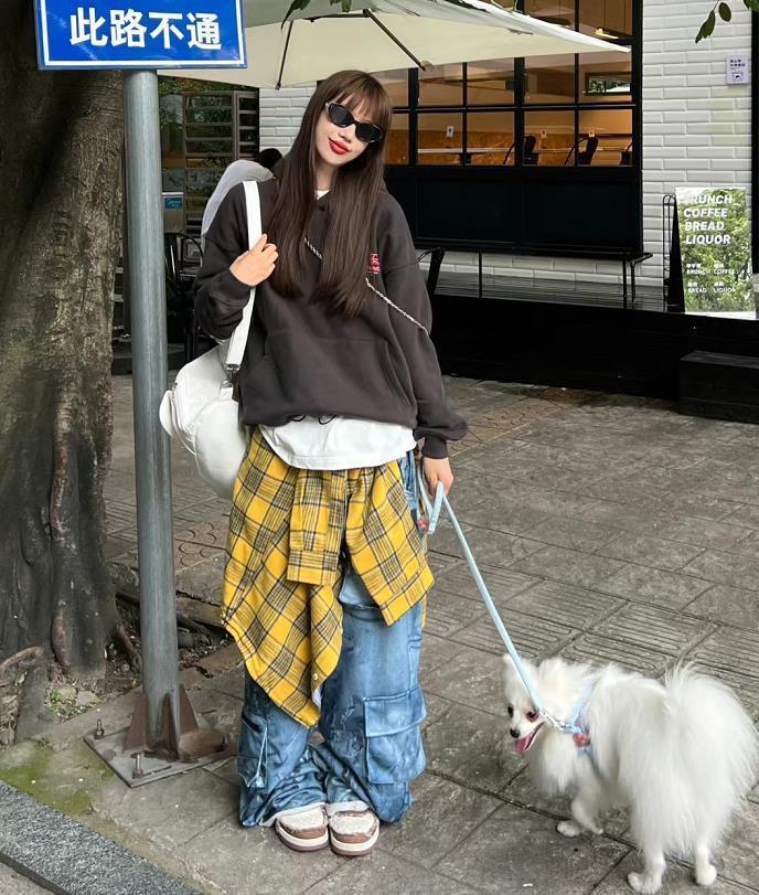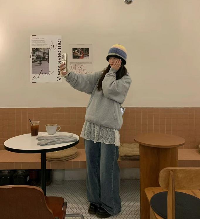 美式甜心的既視感,果然棕色衛衣和藍色牛仔褲組合,就成了復古美式風,衛衣裏面還進行了疊穿,增加了層次感還時髦。