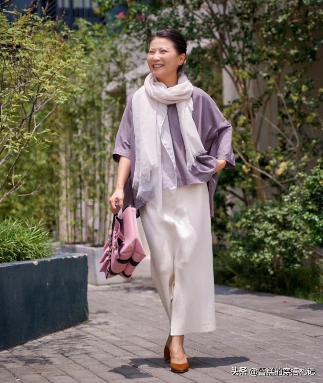 放寬款式的服裝對於中年女人的包容性是很強的,無論是褲子還是裙子,放寬穿搭版型之後,就可以幫助你修飾漂亮的線條,更加遮肉的穿法,稍微穿厚一點的面料也不會顯臃腫。