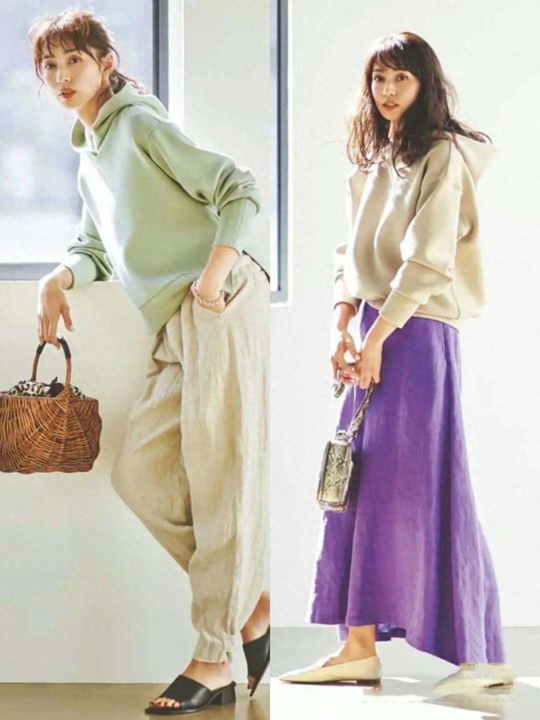 淺綠色或者淺駝色的連帽衛衣,可以的搭配剛剛及腰長度的款式。不管是配浪漫輕柔的長裙,還是配文藝風、棉麻質感的束腳褲,都散發出女性的溫和大氣。