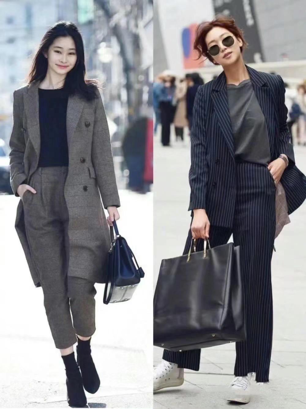 對於需要通勤上班的女人來講,西服套裝也是不可少的搭配。長款的西服套裝,更加時髦洋氣,也更有辨識度,條紋西服套裝相對於純色西服套裝,更加高級顯瘦。
