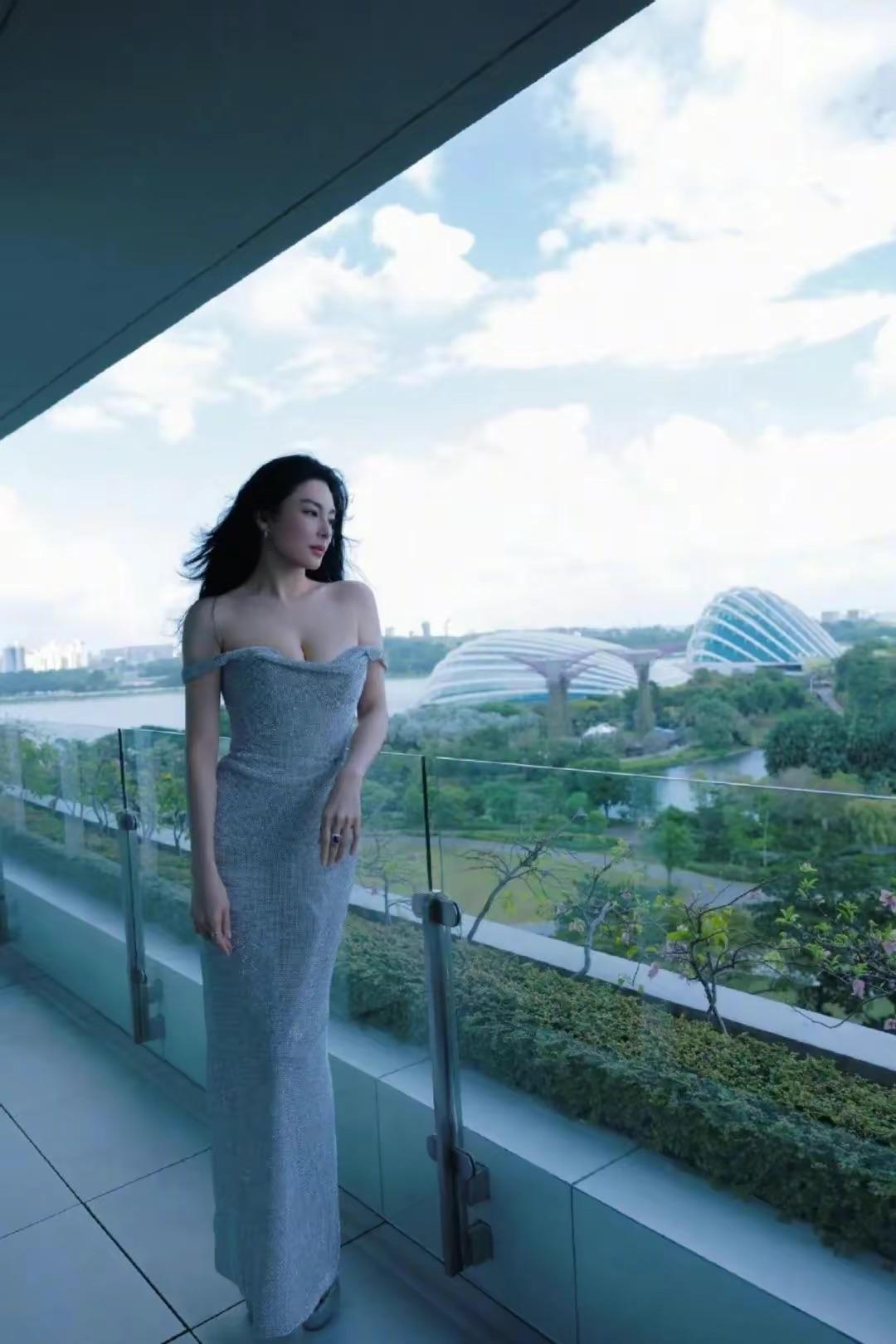 張雨綺的這條裹身裙,不管是色彩、還是款式,都非常醒目。裹身裙的設計,以銀白色爲主色調,呈現出一定的閃耀感、特別的高級醒目。
