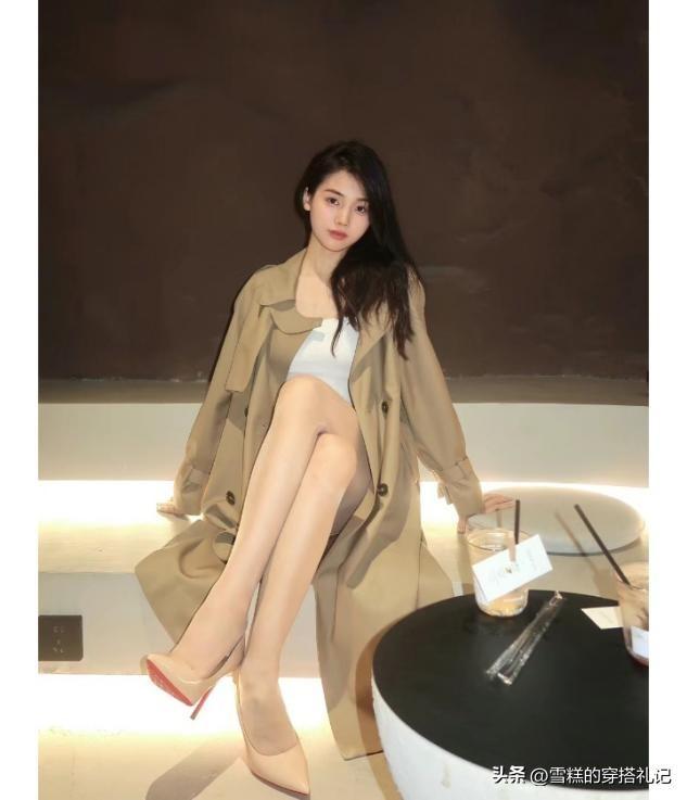 當我們的內搭和風衣選擇同種顏色的時候,極簡的同色系穿法就是最好的選擇,那麼高跟鞋,無論是皮鞋還是裸色面的單鞋,配色都要有一定的協同性,視覺上看起來包容度更強。