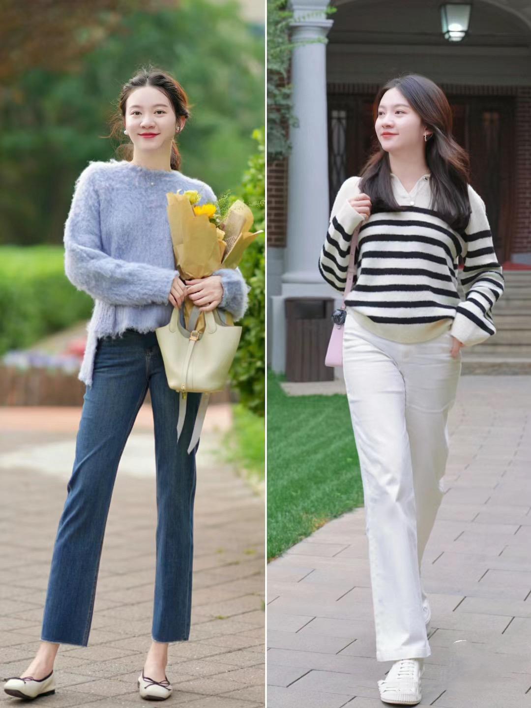稍微輕薄一點的針織衫,有一種更加柔和百搭的效果,穿起來也更加清新甜美。我們可以用輕薄的針織衫,配面料挺闊的直筒牛仔褲、或者半身裙。