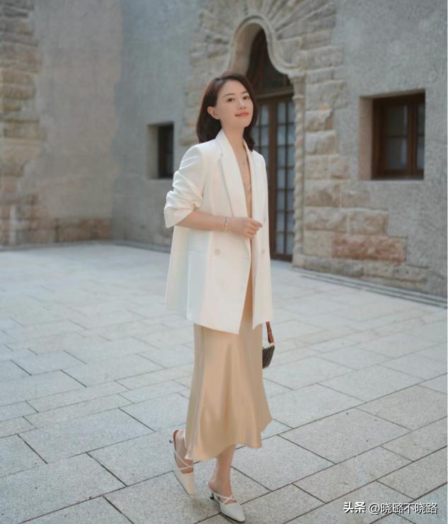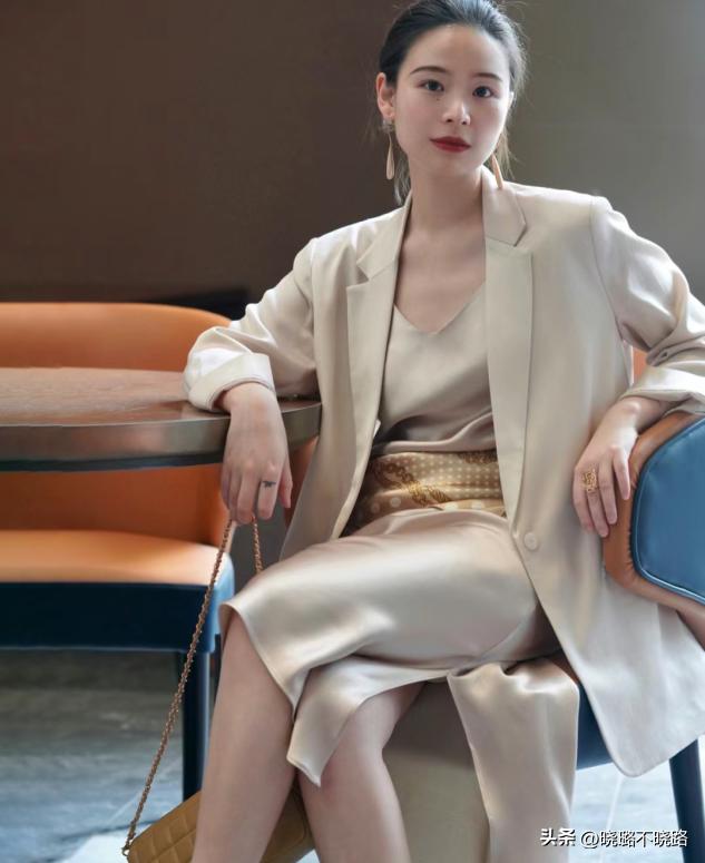香檳色的裙子想要穿的更加高級,一定要在面料上嚴格把關,建議大家多試試光澤感強且有垂墜感的面料,比如真絲、緞面等等,修飾身材同時增加質感。