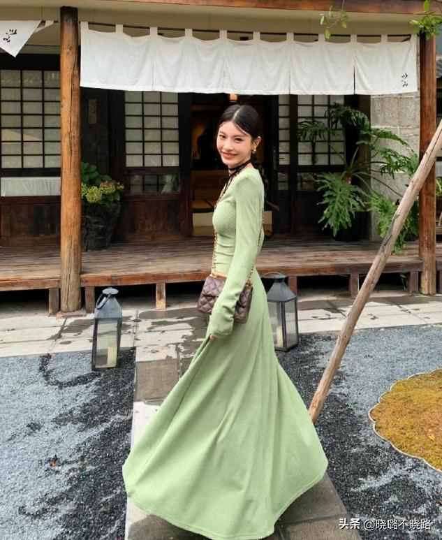 如果想要整體更加清新減齡一些,大家可以多嘗試下綠色系的裙裝,這個色系和樹木與青草的顏色相同,自帶清新的視覺感受,穿在身上清冷氣質達到了頂峯,冬天穿還可以打破暗色繫帶來的厚重感。