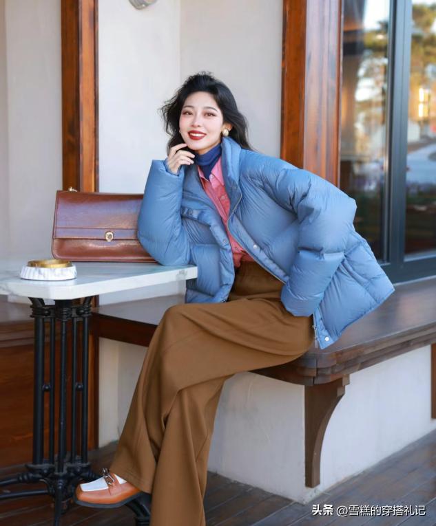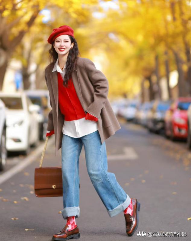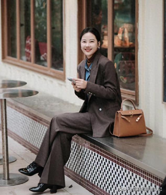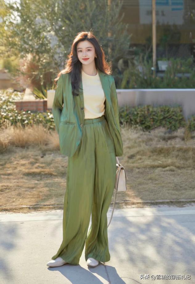 像這種彩色系的闊腿褲成套搭配起來會更加的溫柔知性一些,但是整體的配色難度也直線上升,建議大家選擇一雙低飽和度的杏色樂福鞋,用淡雅的杏色進行協調,使得穿搭更加和諧自然,而且有了杏色的綜合效果,即便是稍微亮一些的顏色,也能夠輕鬆穿出高級質感。