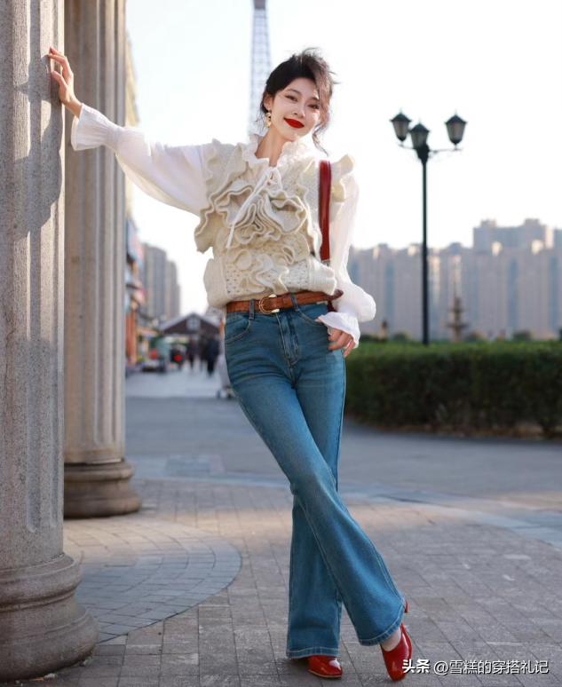 早春季節想要將闊腿褲穿的更加時尚洋氣,關鍵點在於平衡感。下半身配上窄窄的鞋子很大程度上削弱了闊腿褲的帶來的厚重感,那麼上身要保持輕盈,使得整體更加具有平衡?還可以嘗試這種輕薄的針織毛衣,或者幹練的襯衫配上牛仔褲腿褲上緊下松的配合,顯得更加有型。