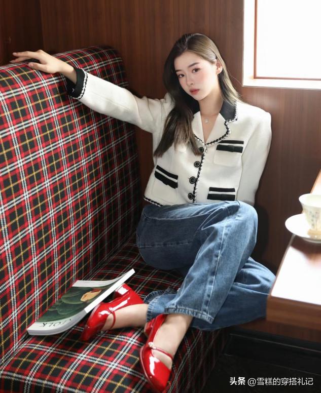 由於瑪麗珍鞋本身就屬於法式復古意味比較濃烈的鞋子,所以除了搭配上覆古藍牛仔褲之外,大家也可以選擇一些小香風設計的外套或者襯衫,和瑪麗珍鞋的風格保持一致,上下的呼應感極強,使得整體穿搭更加完整和諧。
