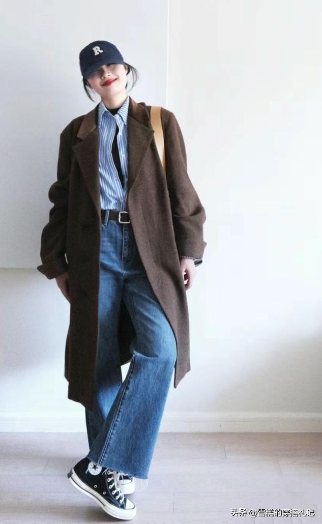 這個造型的配色要更加重要一些,這才能更好地突出氣質,比如這種整體偏暗色調的褲子,搭配自然棕色、黑色這些深色調的鞋子配合,整體會更好一些。但是需要記住闊腿褲,儘量選擇合身長度,不要將帆布鞋完全隱藏在褲腿裏