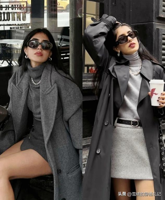 用短裙單品來組合外套,我們可以靈活的展現出穿搭的長短線條,外套的疊穿效果,用小高領的內襯來優化肩頸曲線,短裙的穿法可以露腿,內外單品用深淺不一的灰色來進行疊加,同一種顏色的組合也不會顯得單調。
