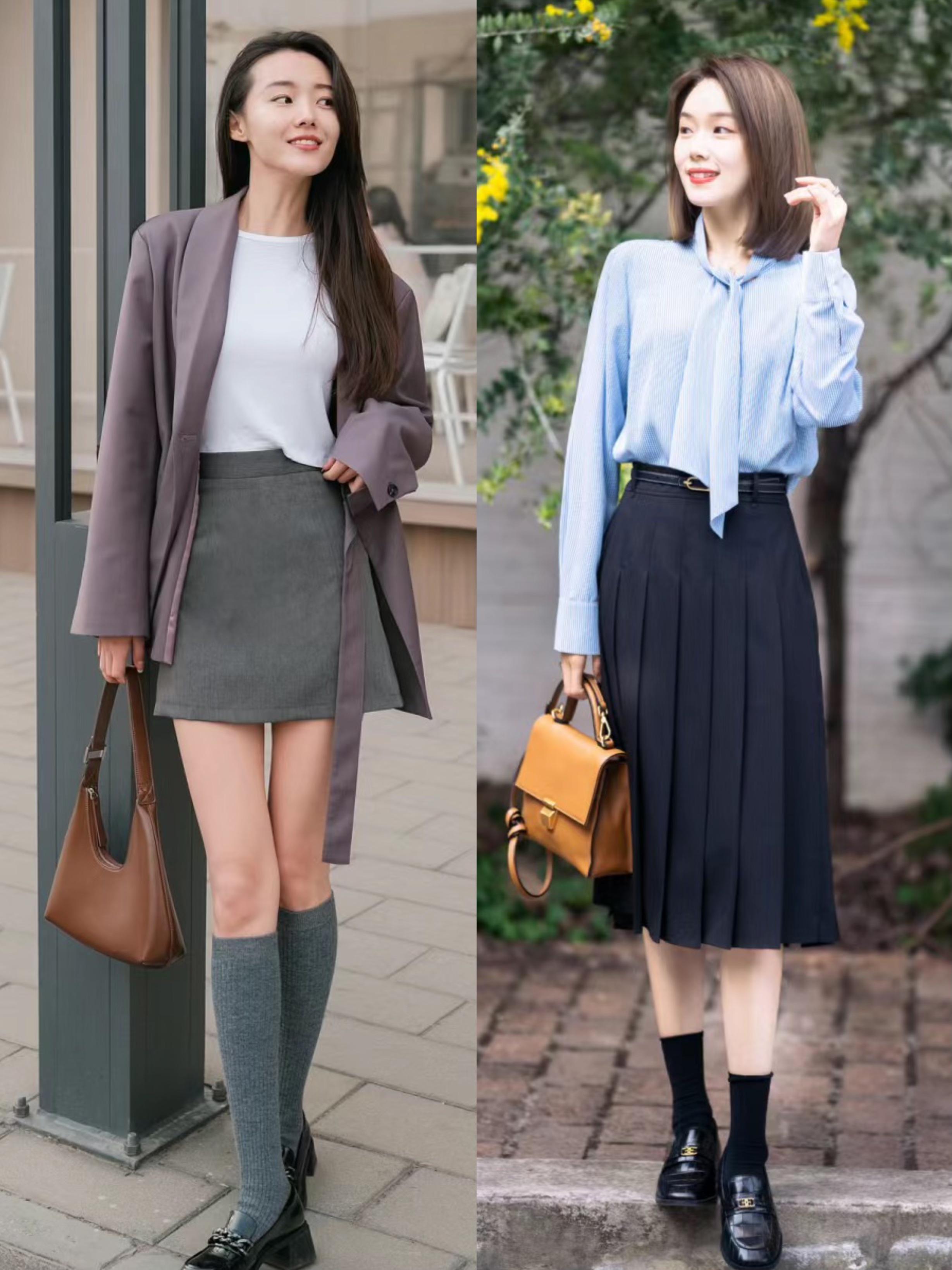 黑色樂福鞋想要穿出溫和減齡的美,我們可以搭配中筒襪或者小腿襪。如果想要一種學院風的穿搭,那麼黑色樂福鞋+小腿襪就是不錯的搭配,早春穿起來也更加保暖。