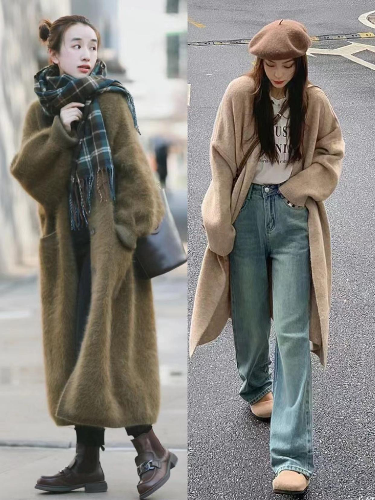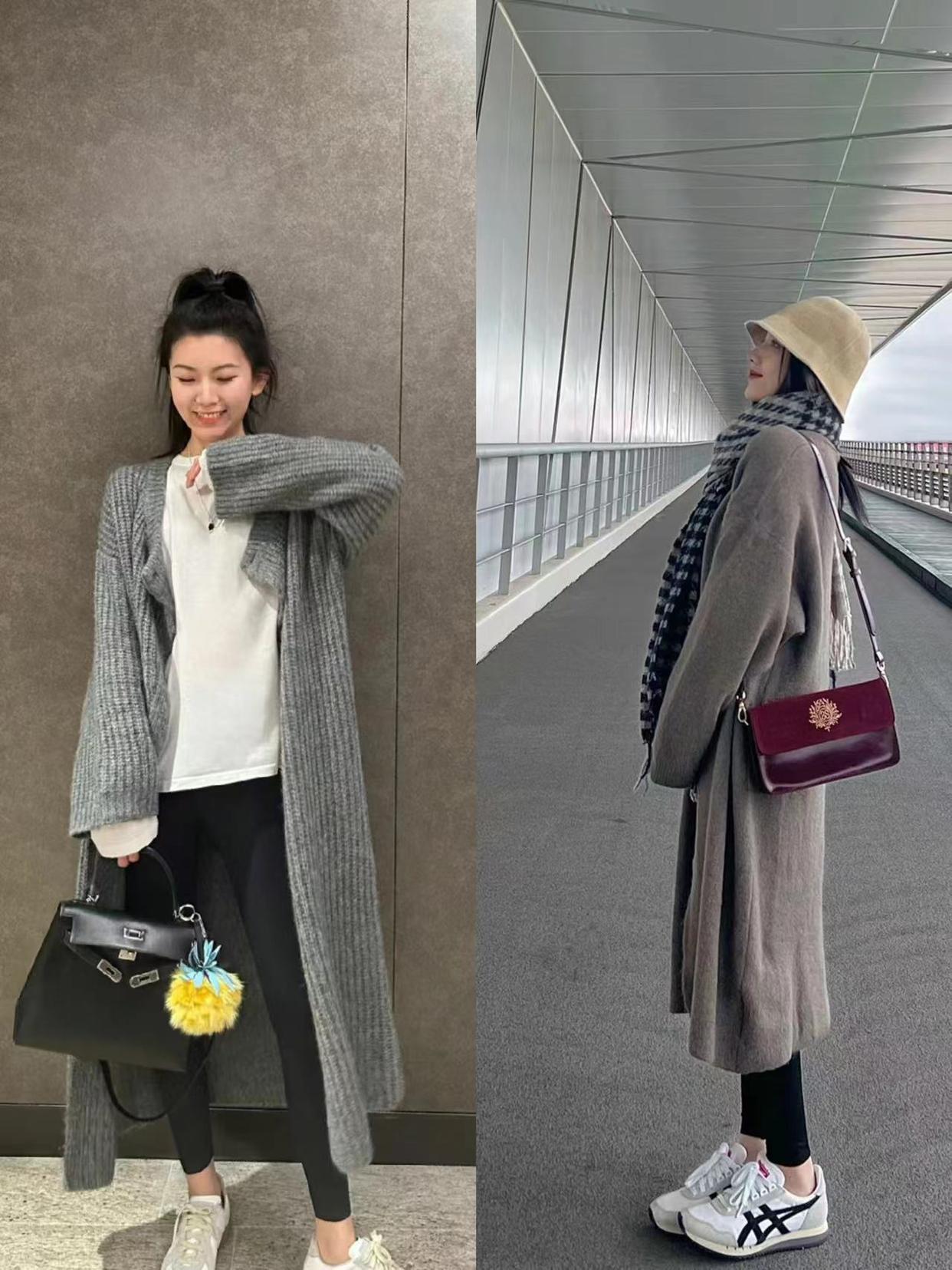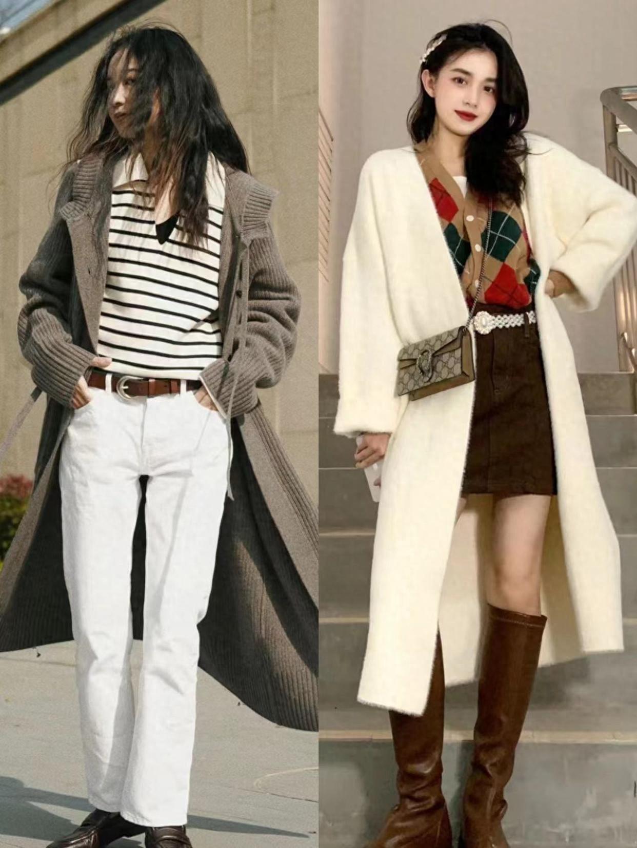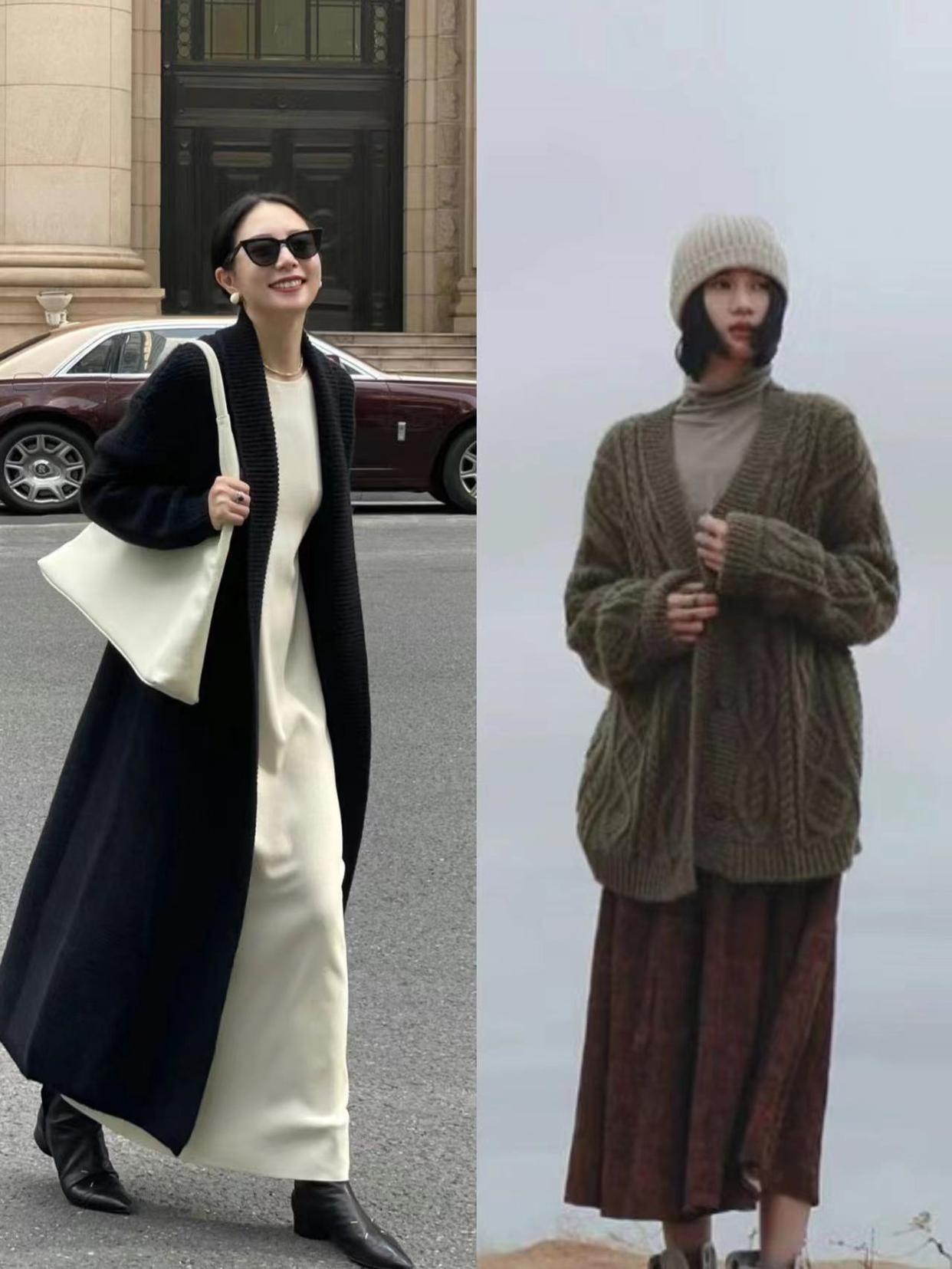 相對於基礎款的奶奶長衫,當下的奶奶長衫設計上更加新穎。不同粗細的針織元素、不同的色彩寬鬆度、以及不同的領口細節,都塑造出不一樣的風格。
