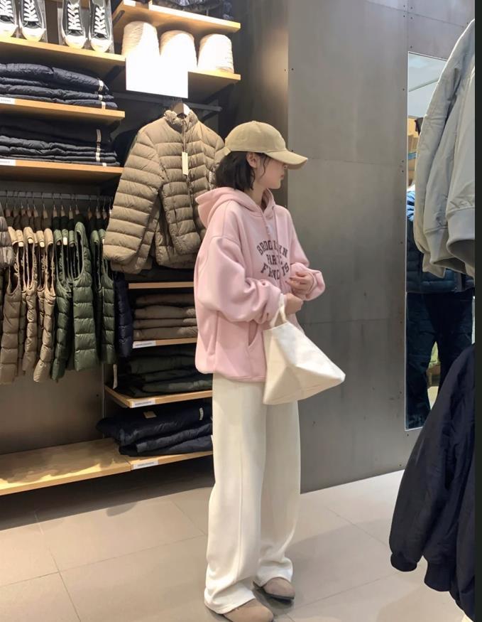 這個粉色連帽衛衣,嫩嫩的顏色,超正的一個色系,在春天就是很適合穿亮色,好減齡啊,選擇白色闊腿長褲來配,一整個鬆弛感,休閒又舒適。