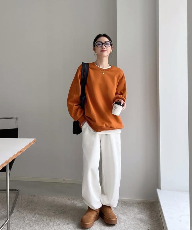 這個橘色系的衛衣也太好看了吧,在日常穿搭裏,黑白灰穿得太多了,偶爾穿下彩色會讓人的心情變得很好。奶橘色,是不挑人的那種亮色,很襯膚色。