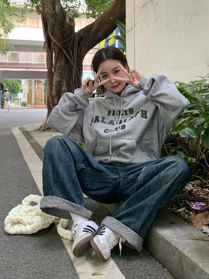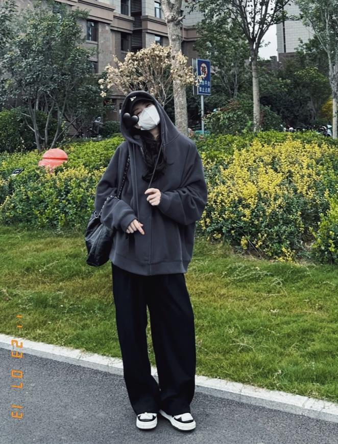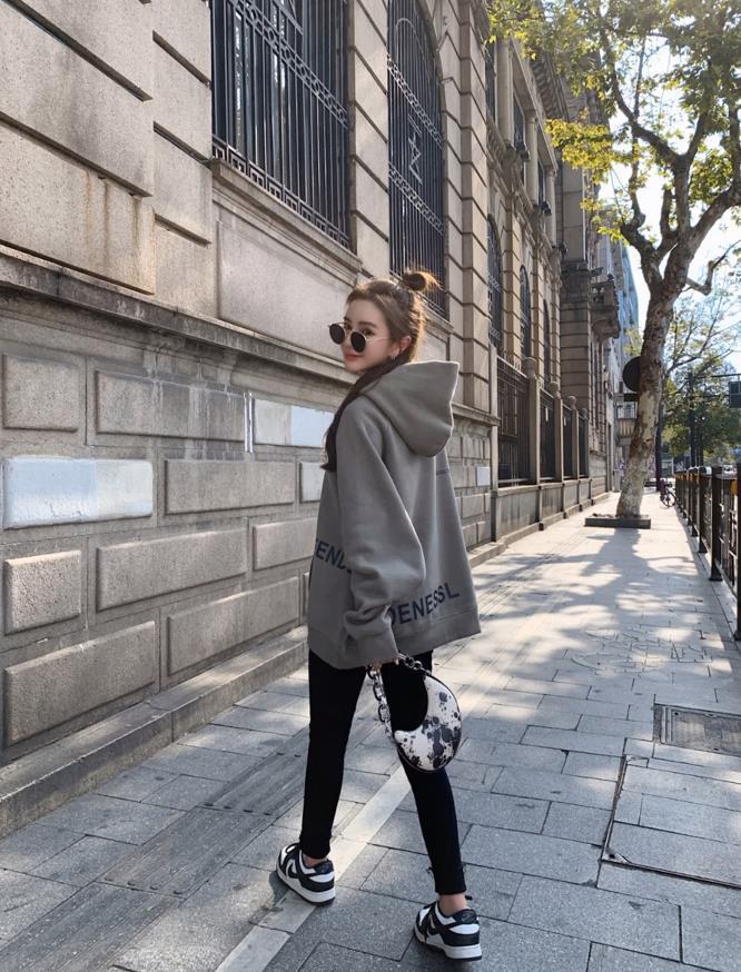 這套完全是我的菜啊,灰色狗狗衛衣好韓啊,寬鬆的版型,輕鬆穿出鬆弛感,也給予身材無限的包容,顯瘦效果簡直絕了。