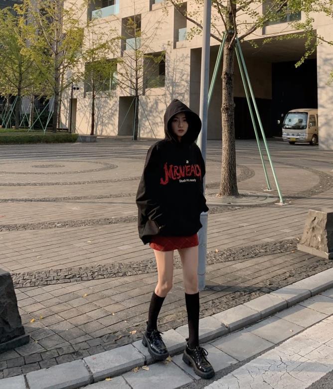 小個子的女生若選擇大一號衛衣來穿,可以直接玩轉“下身失蹤法”,黑色連帽衛衣,下裝配的是紅色短裙,露出腿部大部分肌膚,不僅拉長腿部線條,還顯高挑。