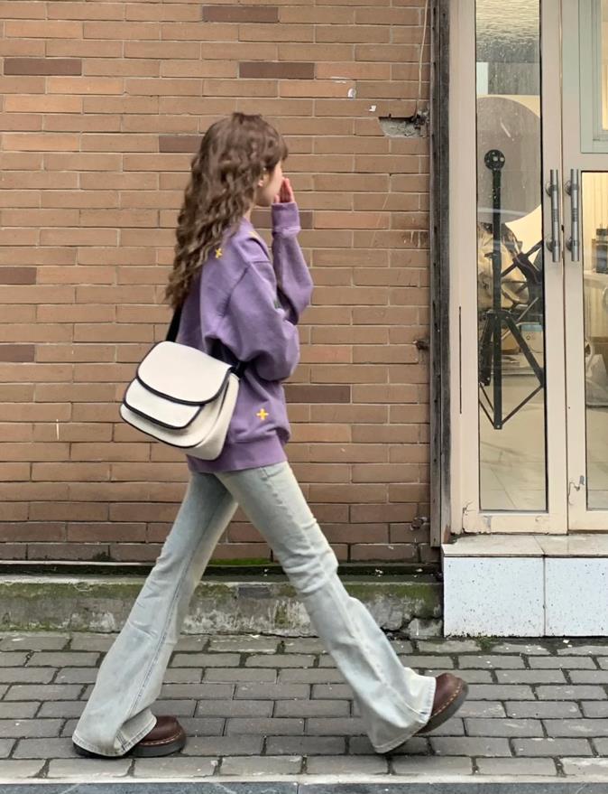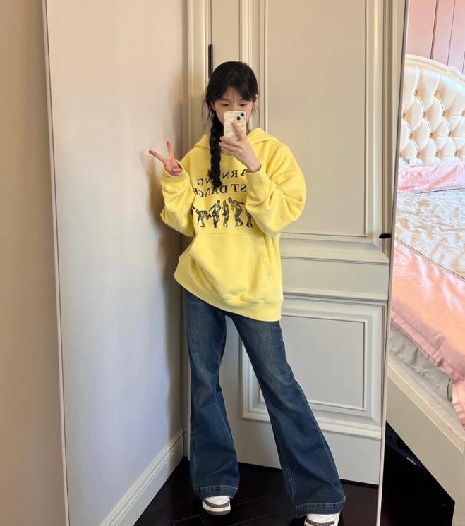 嫩黃色衛衣+復古微喇牛仔長褲,好喜歡這套啊,特別是褲子,穿上身後腿部比例瞬間拉長了,說這腿有一米八都不過分吧?