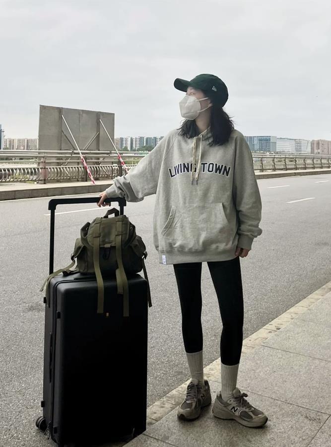 衛衣+瑜伽褲+棒球帽,這一套主打一個休閒舒適,小個子女生可以借鑑起來的穿法,上松下緊,簡直不要太顯瘦了。