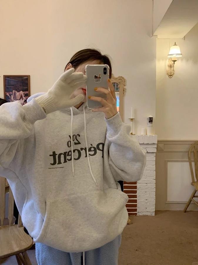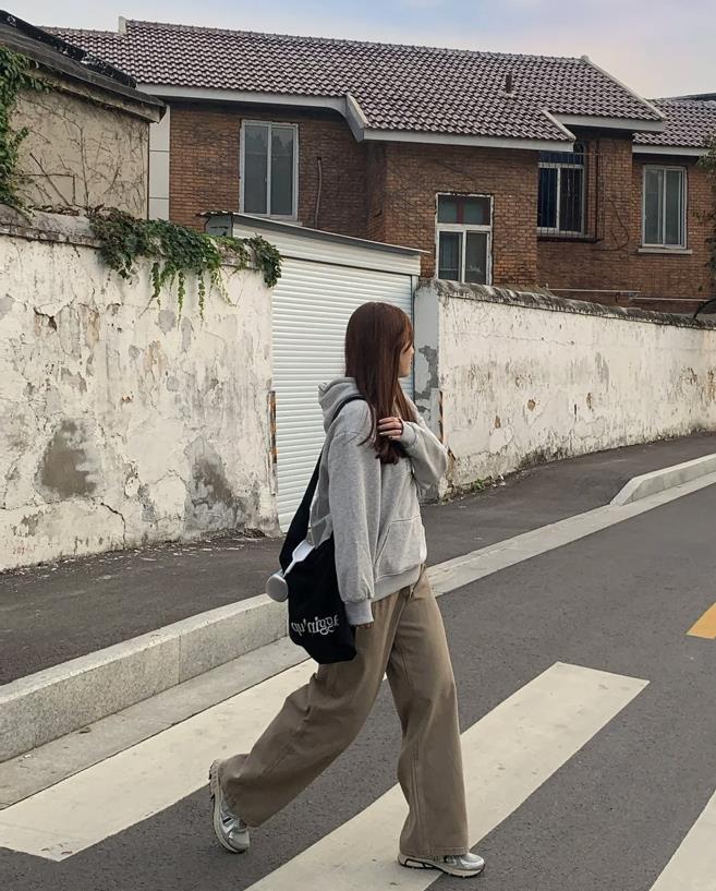 這是屬於微胖女生的韓系慵懶風,鬆弛感十足,灰色連帽衛衣+休閒長褲+運動鞋,無性別風的搭配,誰穿都好看。