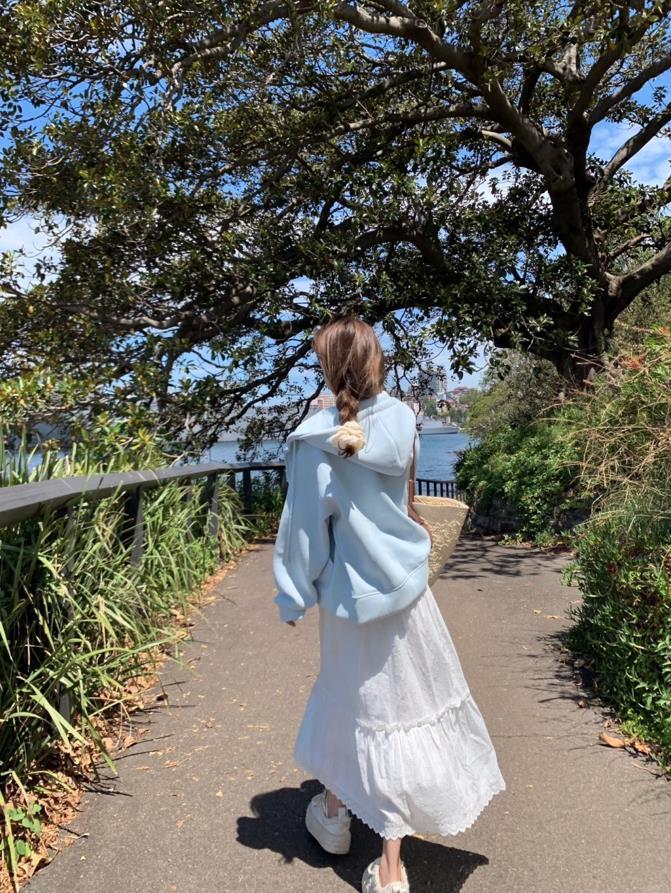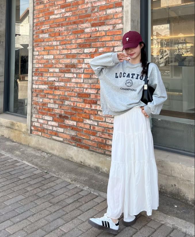 灰色字母衛衣+白色半身長裙,灰色和白色的配色組合,瞧着就很清爽高級,加上棒球帽和運動鞋點綴,很韓系的穿搭。
