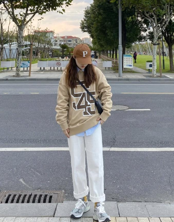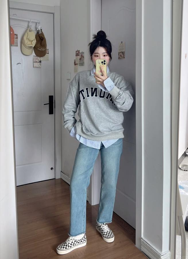 灰色圓領衛衣+襯衫疊穿,學院風滿滿,下身搭配的是一條淺色牛仔直筒褲,簡單又不失日常。腳下棋盤格的板鞋,爲整個穿搭加分不少,也很休閒。