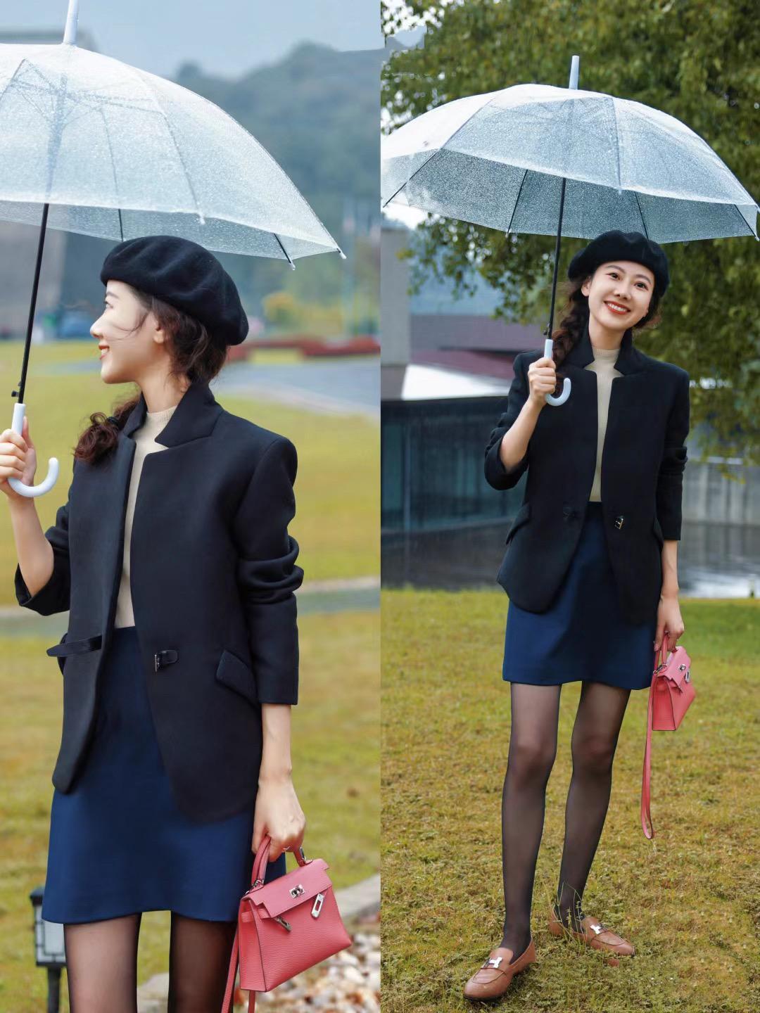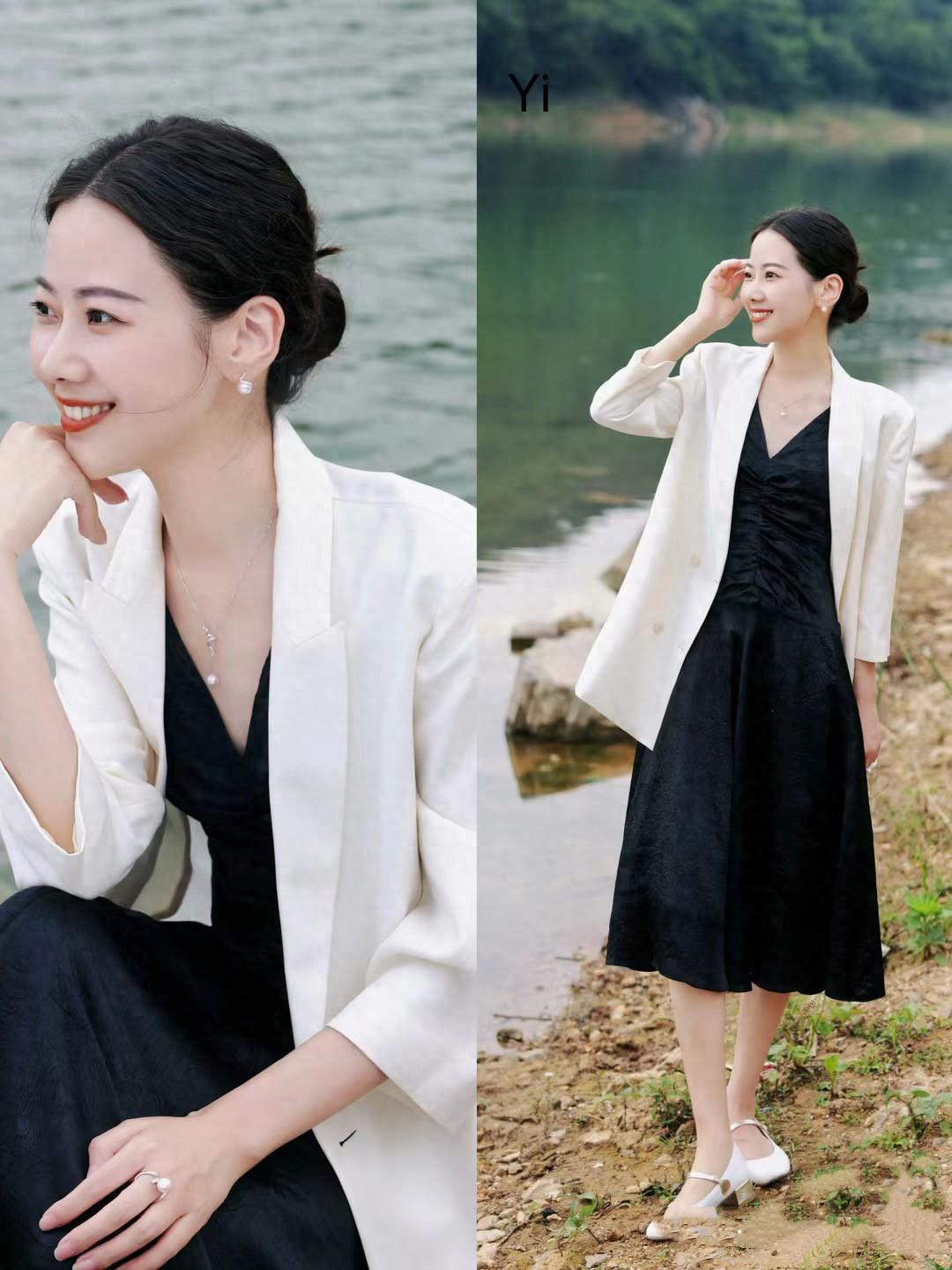 非黑即白的穿搭,總是有別樣的魅力。帶着幾分清冷、又分外的高級。垂順利落的西服外套,搭配赫本風的黑色連衣裙,婉約又大方。