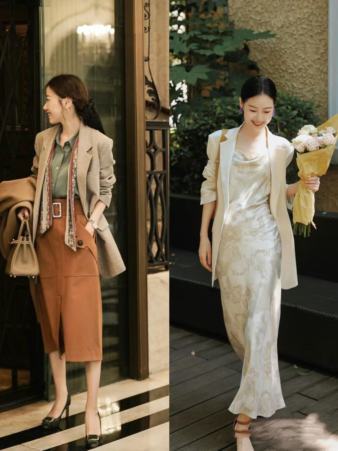 米白色的西服外套,自帶溫潤大氣的美。配上提花圖案的緞面連衣裙,婉約又貴氣。米白色西服外套的大方,搭配修身緞面連衣裙的華貴,給人一種富家千金的既視感。