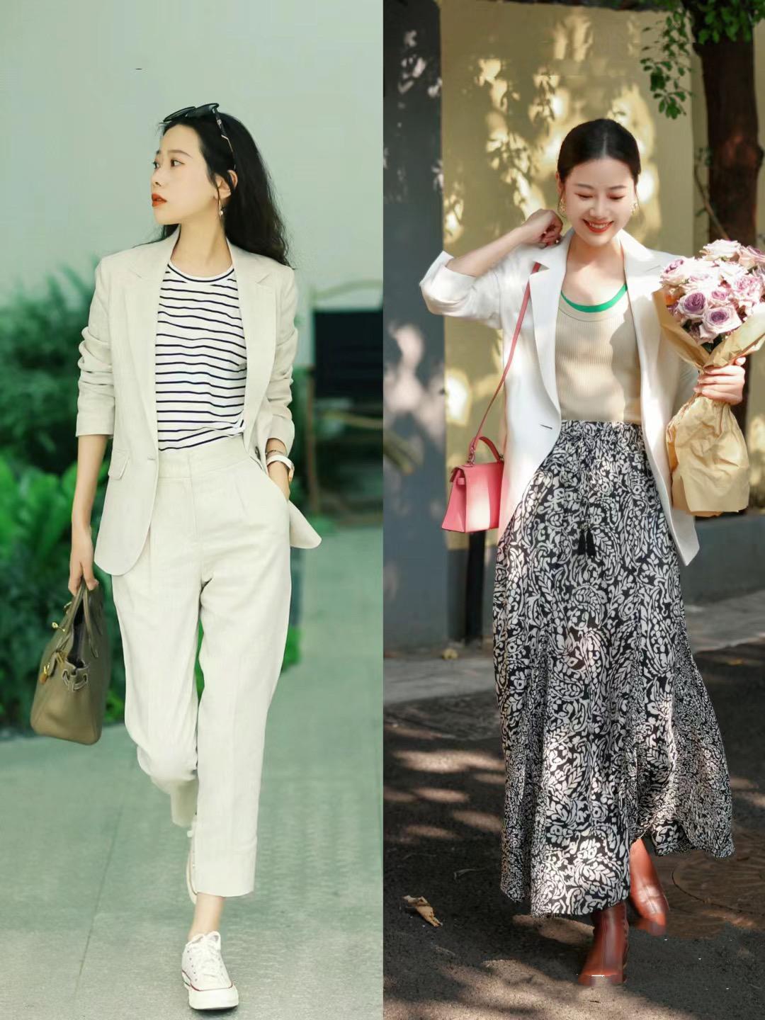 利落的西服套裝,搭配比較清新的色系,也更具備了柔和之美。我們除了搭配帆布鞋表現減齡效果,還可以疊搭條紋T恤,清爽耐看。