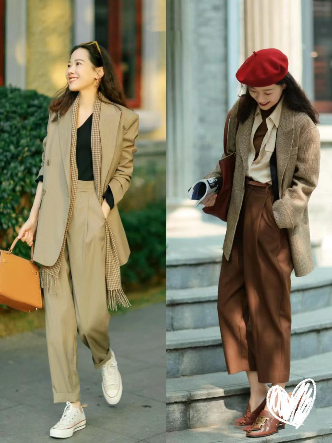 一身咖色西服套裝,搭配了白色帆布鞋,瞬間變得減齡起來。像這種咖色西服套裝的穿搭,有一種大氣又從容的美。配上白色帆布鞋,可以弱化減齡感,更多了輕盈時尚的氛圍。