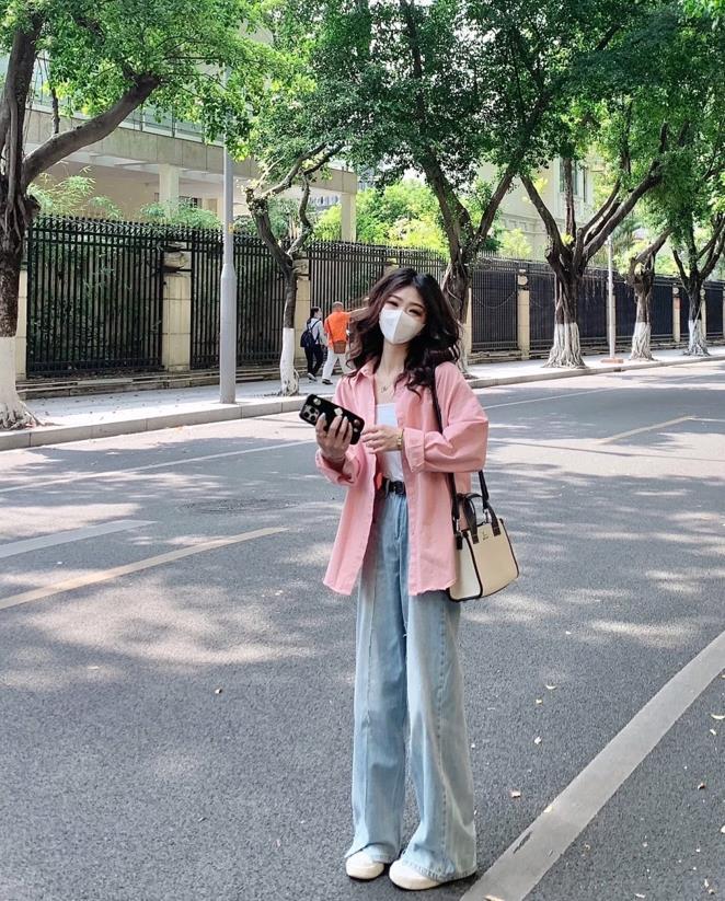 淺淺的粉色襯衫,看起來就非常不錯,內搭白色打底,或者是白色t恤都很贊。下身選擇一條牛仔褲,一雙小白鞋,清新活潑又減齡。