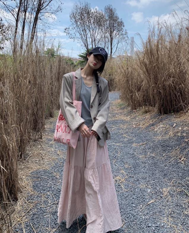 西裝搭配粉色半身長裙,簡約又不簡單,韓裏韓氣的。