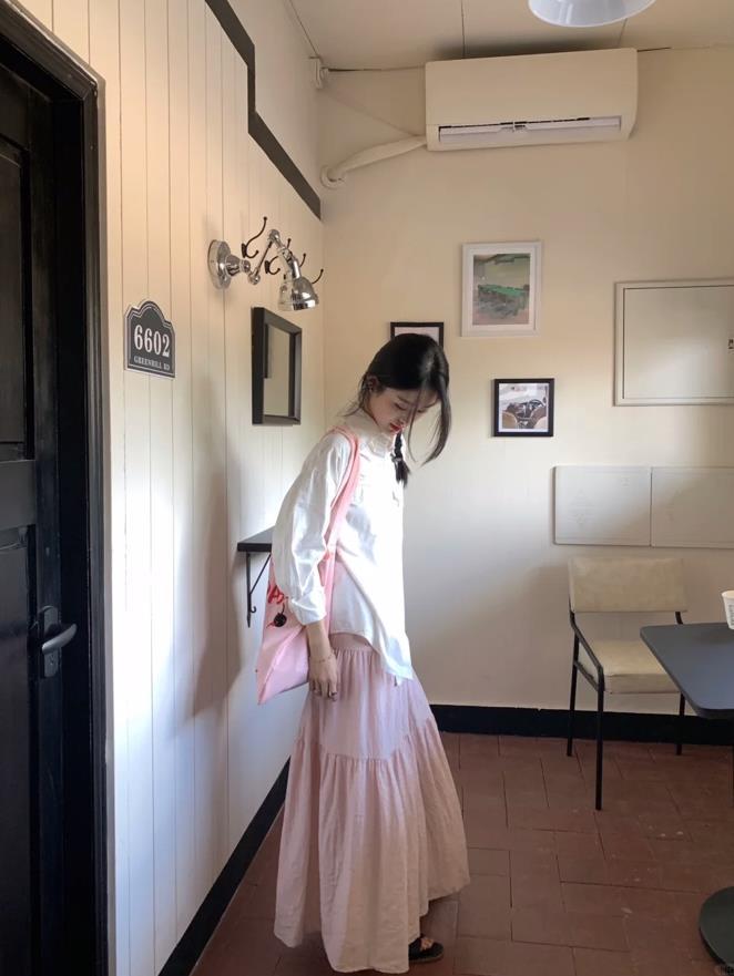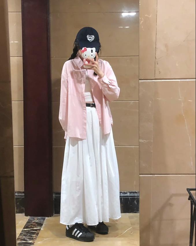 粉色襯衫和小白裙的搭配,真的好可愛好乾淨啊,淺粉色,低飽和度一點都不挑膚色,黃黑皮都可以穿。