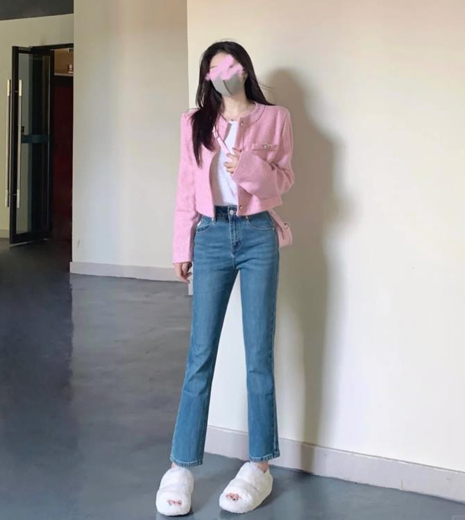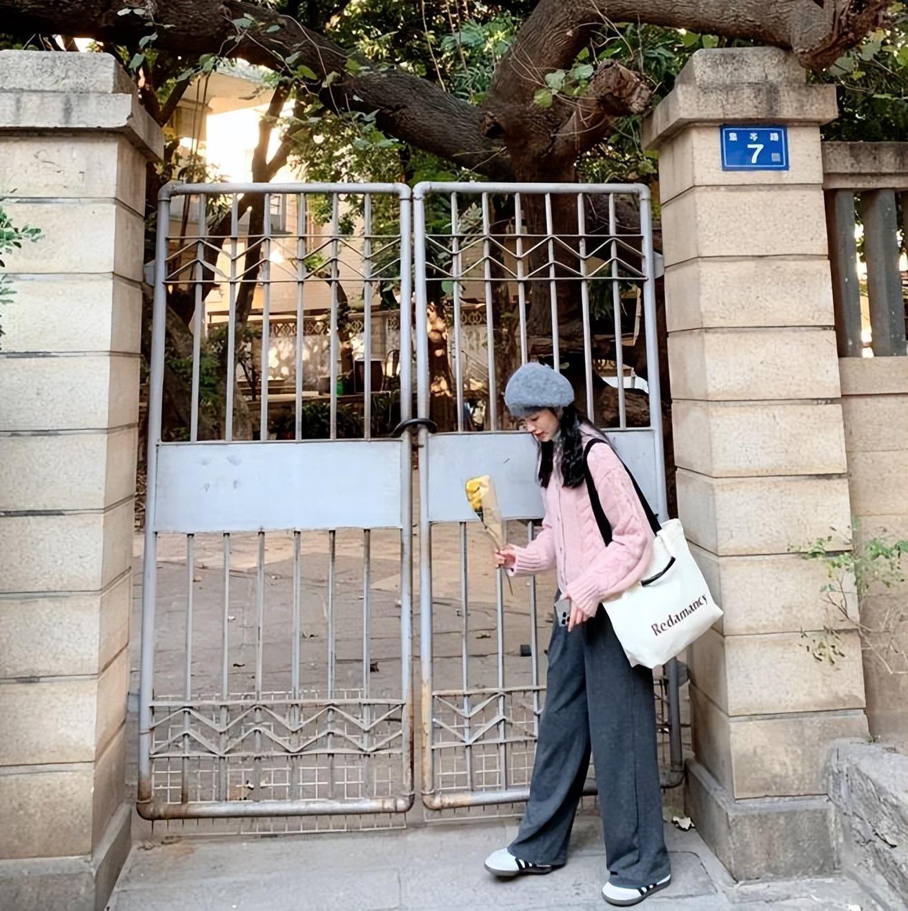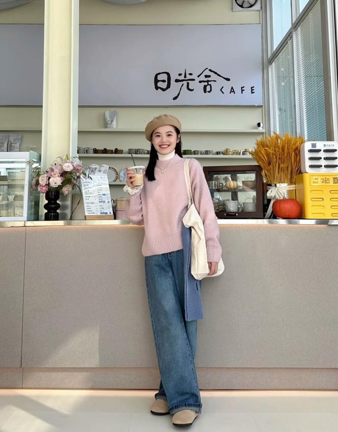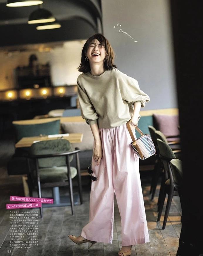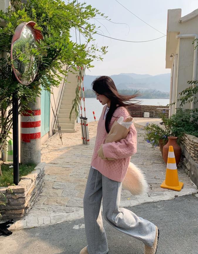讓我看看到底是誰還沒有粉色毛衣?喜歡這種淺淺的粉色,飽和度不高,春季疊穿一件白色t就可以。灰色闊腿長褲,也太顯瘦藏肉了。