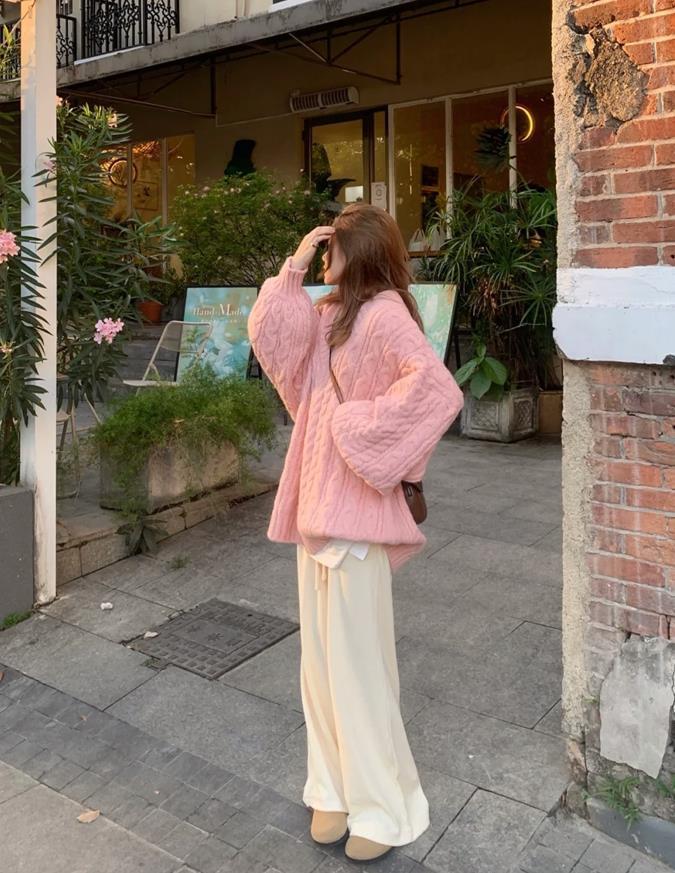 粉色開衫好溫柔啊,淺淺的粉色,不僅顯白又減齡,柔軟舒適的材質,給足你身材包容,更穿出慵懶的味道。搭配白色拖地褲,大長腿輕鬆擁有了。
