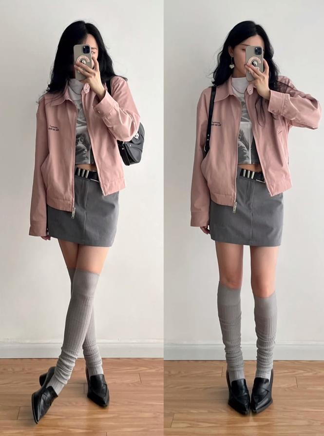 甜酷風的一套,粉色夾克外套,利落的短款,小個子最合適了,低飽和度的粉色,和棕色半裙很配。腳下的馬丁靴,顏色與外套一致,增加和諧度又高級。