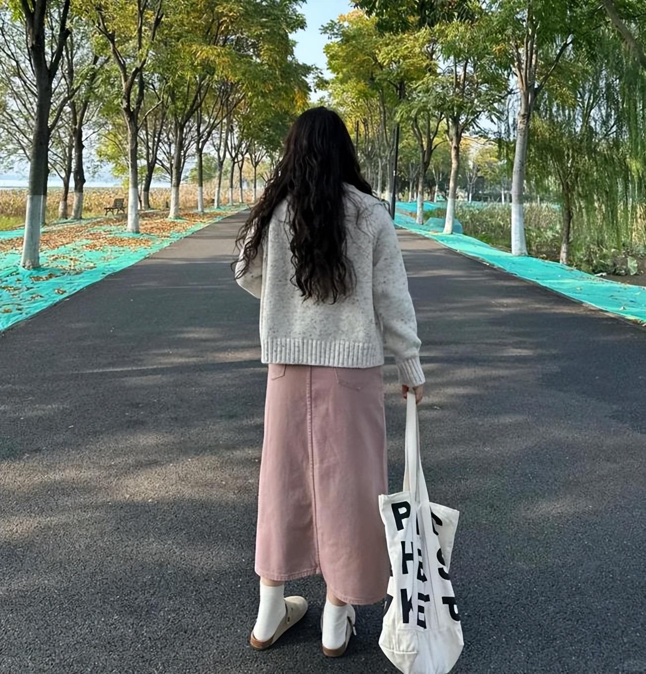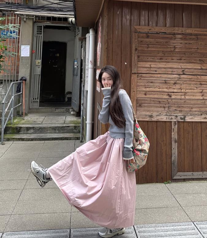 喜歡長裙帶給的鬆弛感,簡簡單單的灰粉搭配,真的一點都看不膩,乾淨又溫柔的色調。