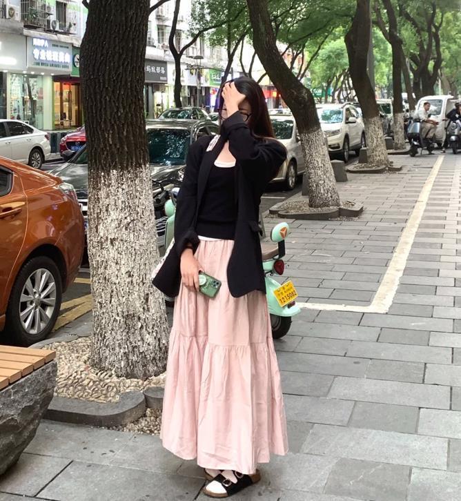 誰的春天沒有一兩條好看的裙子呢?粉色的小裙裙真的好溫柔啊,搭配黑色西裝外套,正好可以平衡黑色西裝帶來的嚴謹和正式。