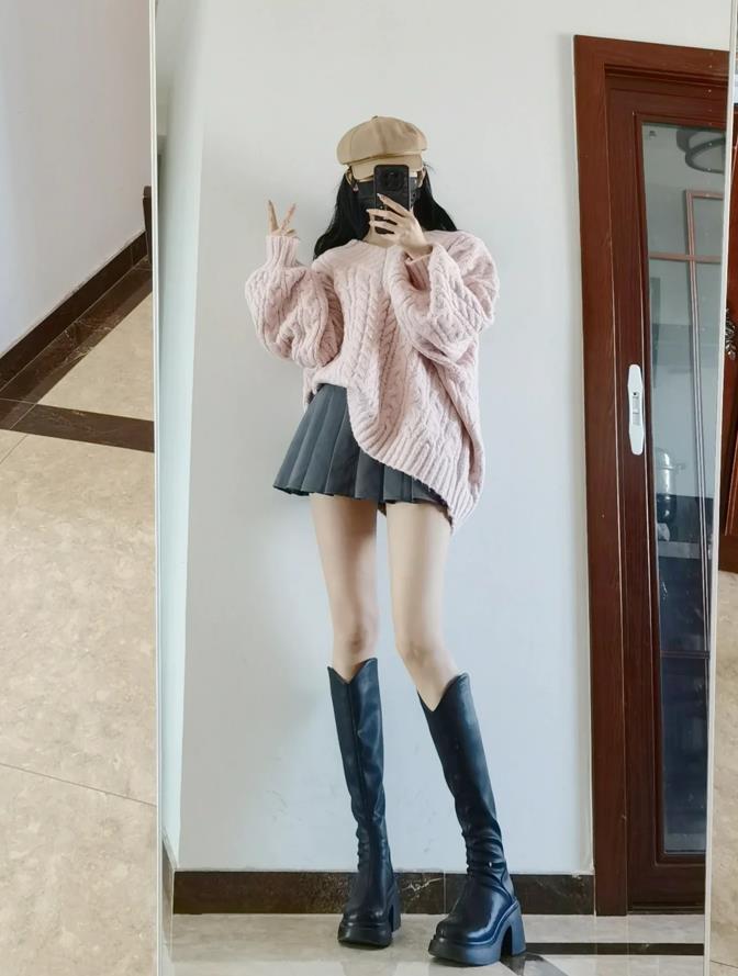 粉色慵懶感毛衣,不能不愛吧?淺粉色,飽和度很低,暗沉膚色穿起來也好看。柔軟舒適的材質,貼身穿也無懼。下身一條灰色百褶裙,讓你搖身一變大長腿美女。