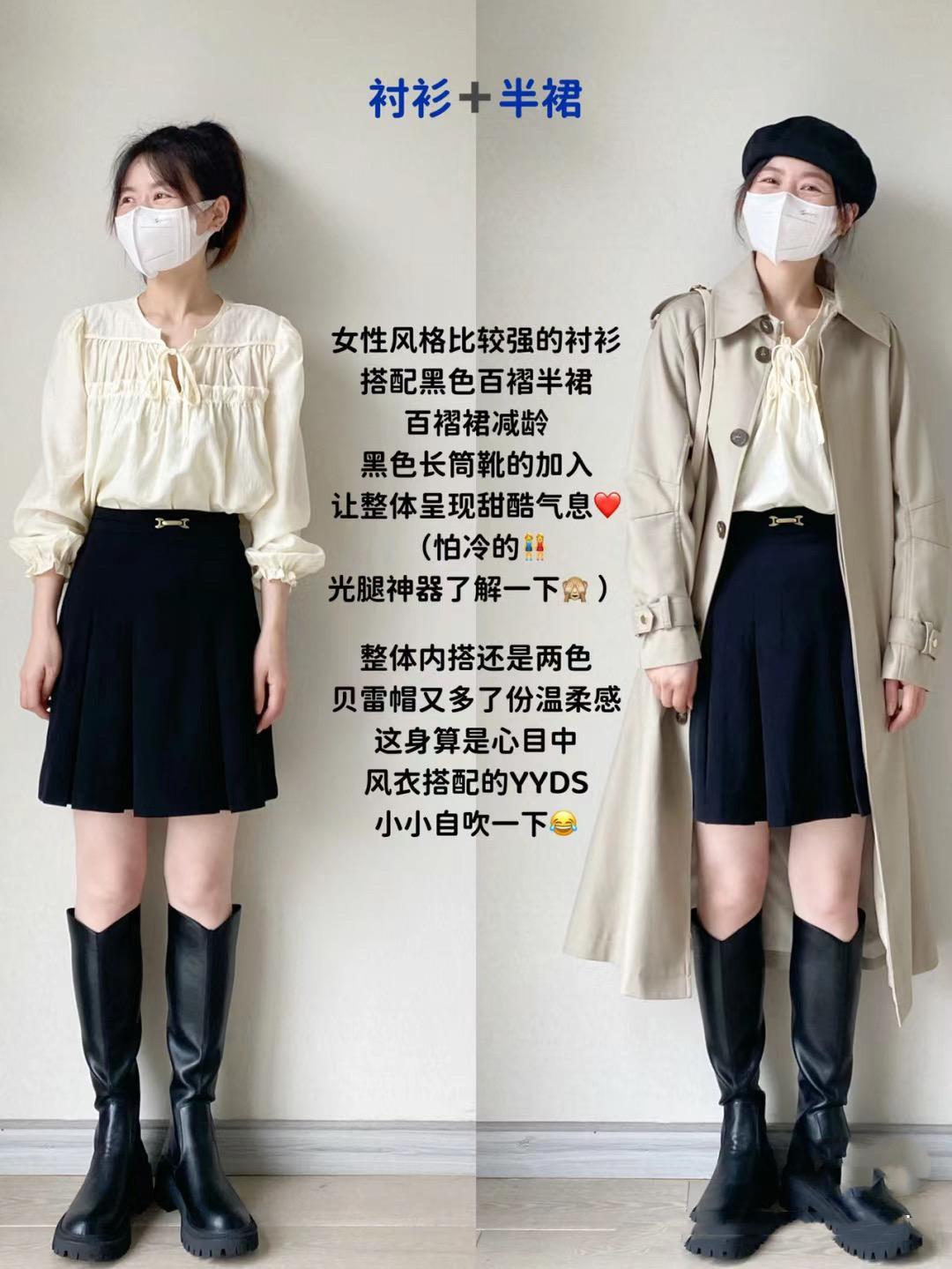 想要一種更加溫柔體面的穿搭,我們在穿着風衣的時候,也可以搭配比較柔美的內搭。這時候襯衫+半身裙的組合,就更具備了女神範。