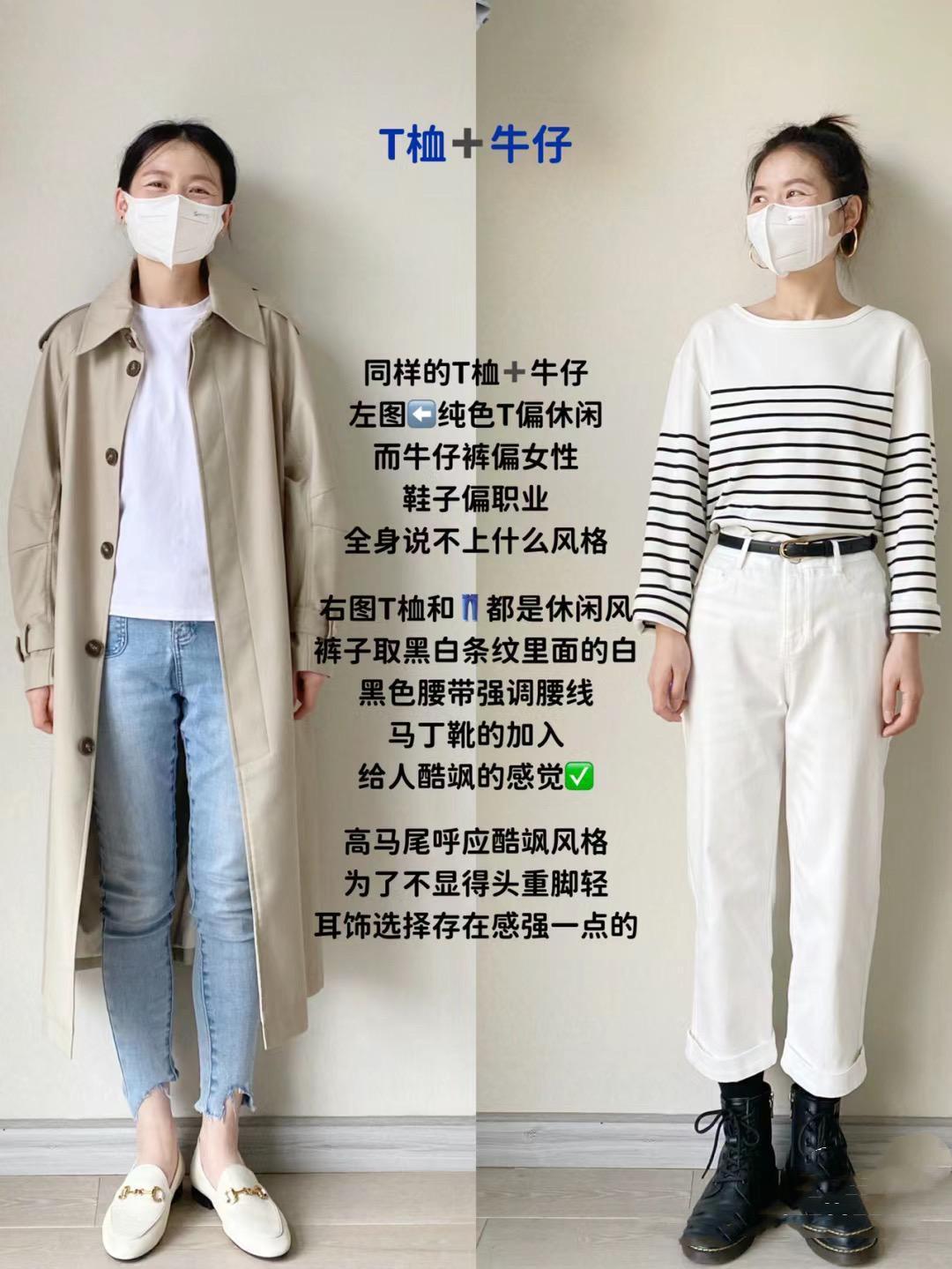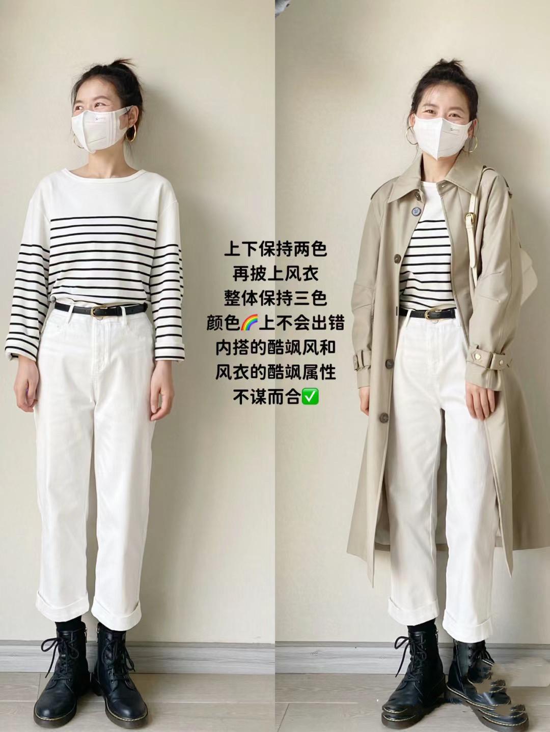 如果選擇基礎款白T+修身牛仔褲作爲內搭,就顯得有些太過日常隨性了,整體體面感不足,而且修身牛仔褲很容易顯腿粗。我們可以選擇黑白條紋T恤,搭配高腰的白色直筒褲。同樣是運用了色彩的呼應,配馬丁靴更加酷颯。