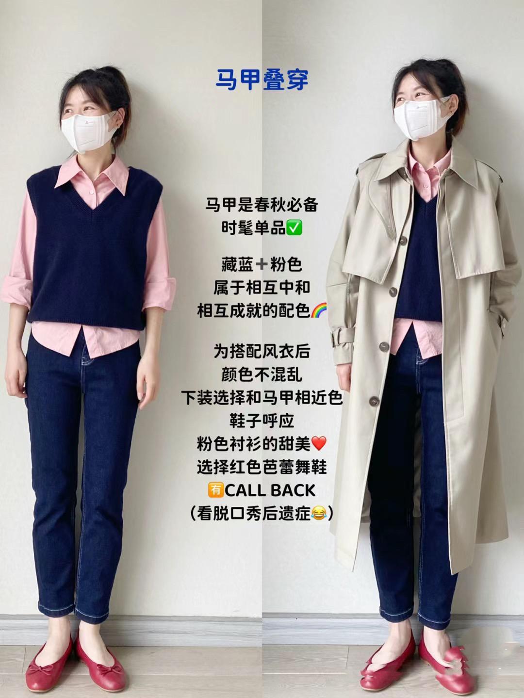 粉色系的襯衫,可以疊搭藏藍色的針織馬甲。互補色的組合,對比度更強,這種色彩搭配相互中和相互成就。針織馬甲與牛仔褲同色系的呼應,利落大方不混亂。