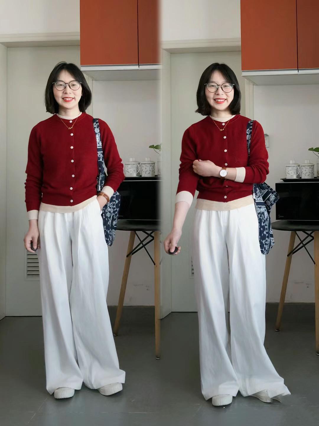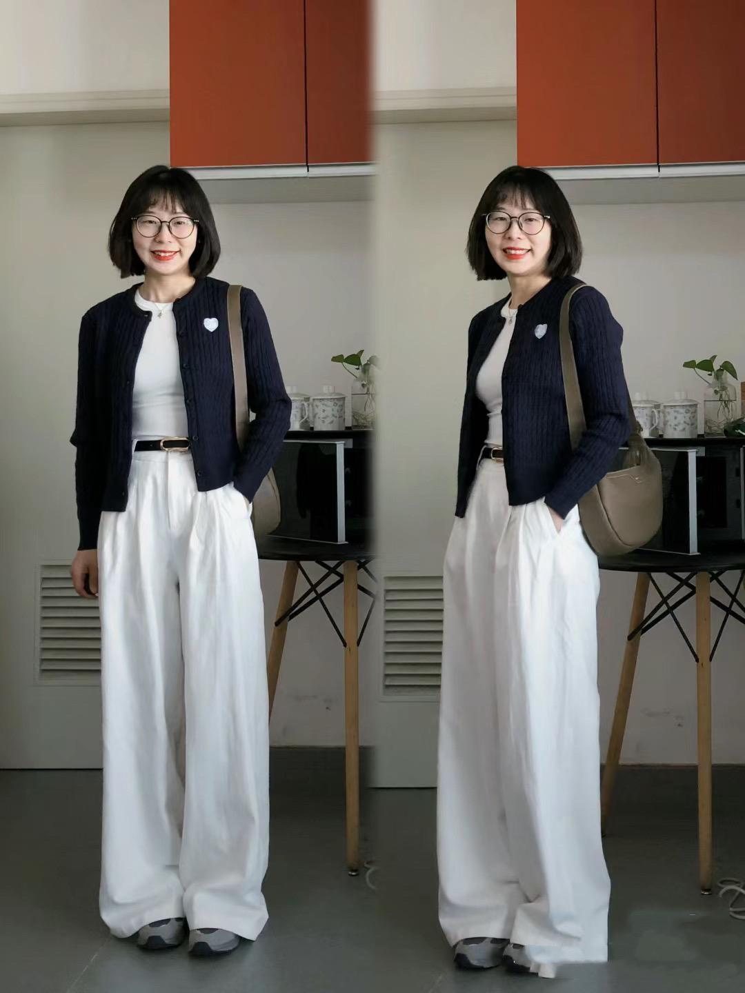 像這種短款的針織衫,更適合塑造上短下長的穿衣方式。壓縮上半身比例的同時,只需要搭配高腰的長褲,就可以拉伸雙腿線條。