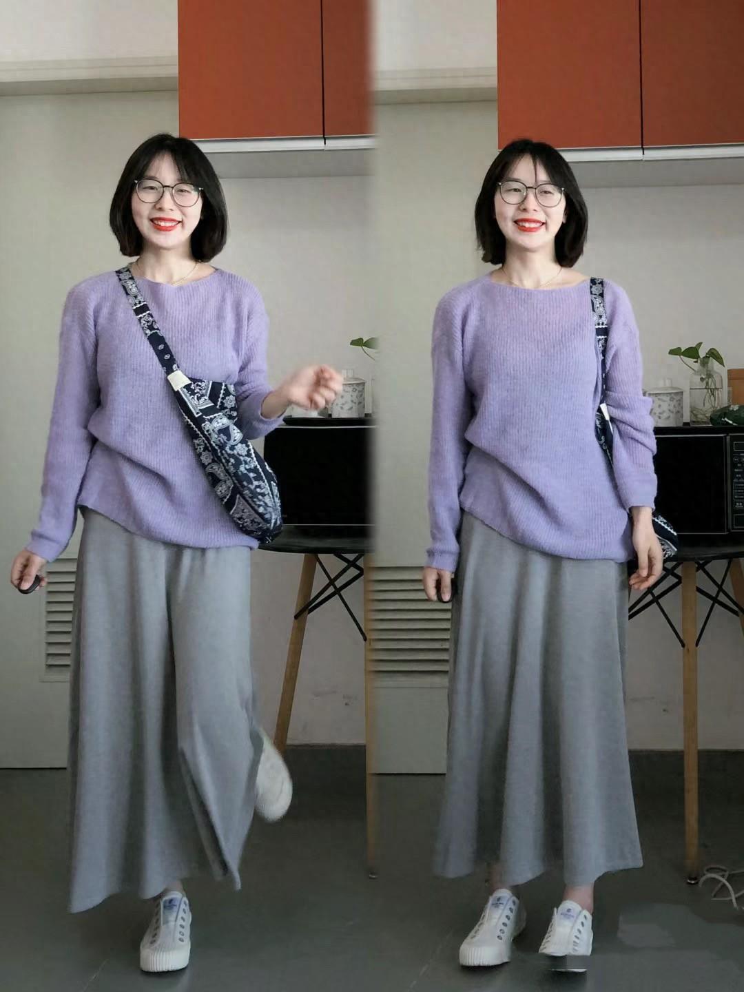 一種舒適慵懶的穿搭,更自然的塑造出時尚氛圍。淺紫色的針織開衫,帶着少女的柔美、也是一種比較顯年輕的穿着方式。