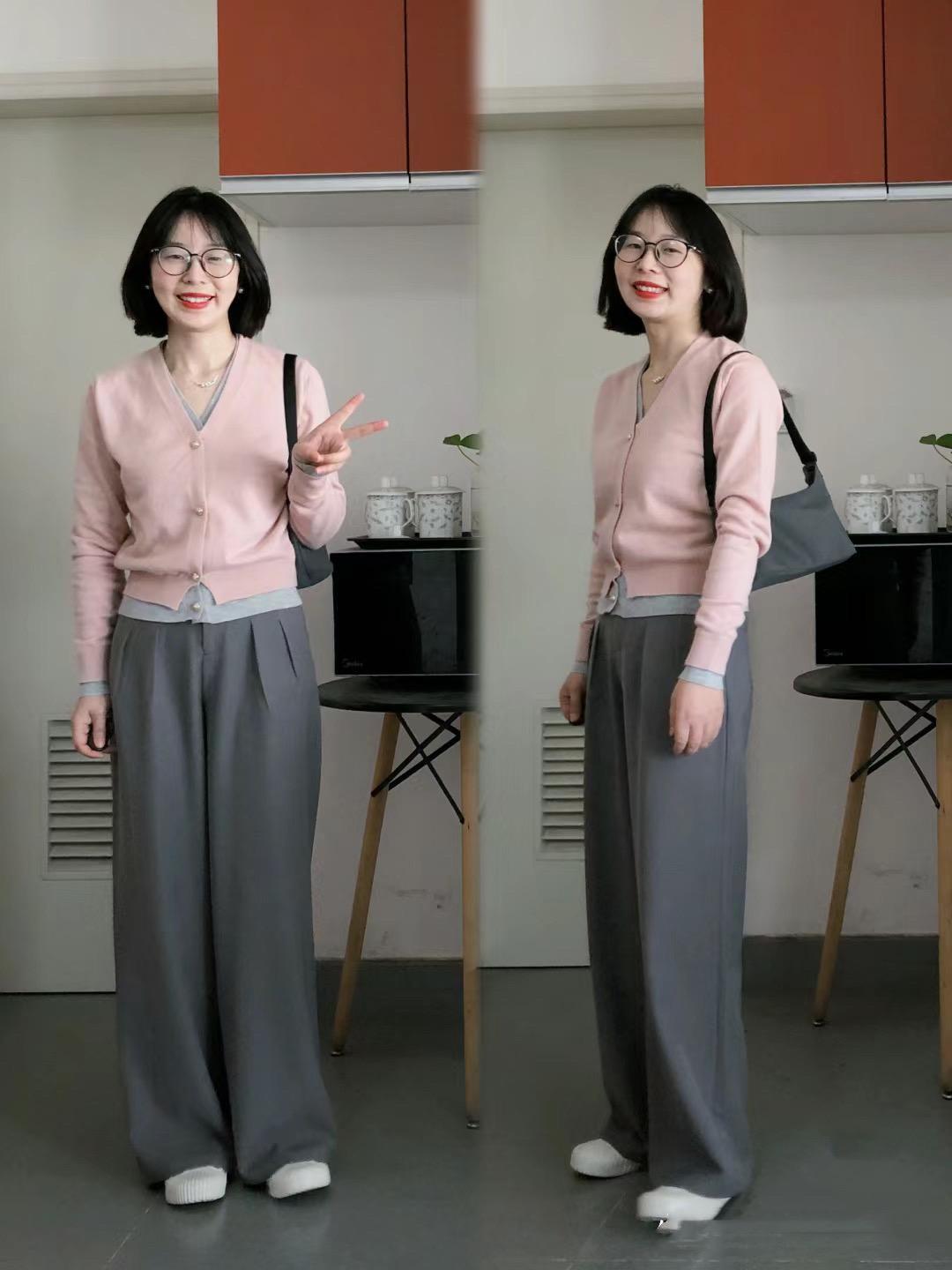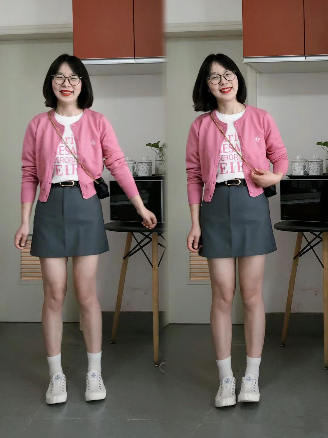 一種俏皮甜美、又比較減齡的穿着方式,還是非常討喜的。像這種淺粉色的針織開衫,疊搭了粉色印花的白色T恤,溫柔又甜美。