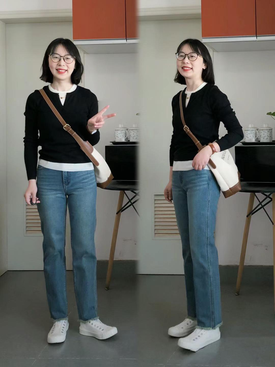 小V領針織衫+白色T恤+直筒牛仔褲