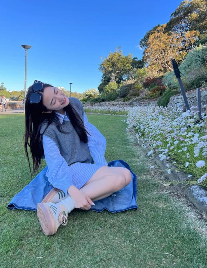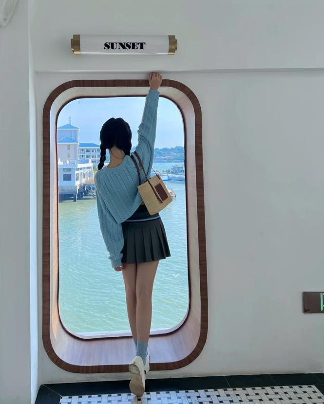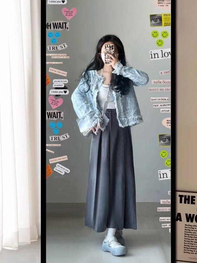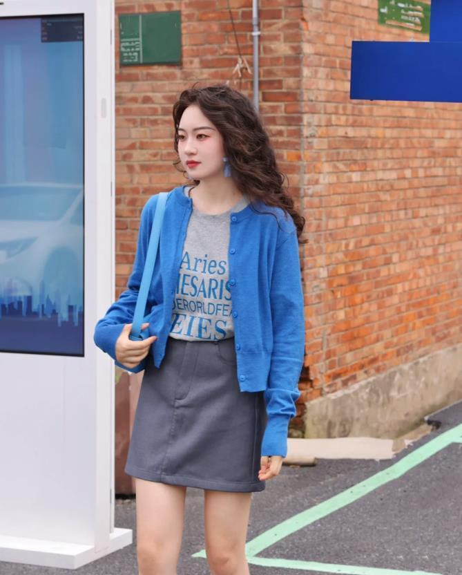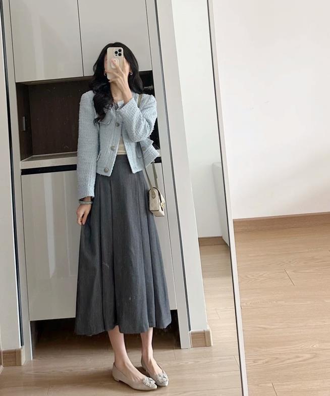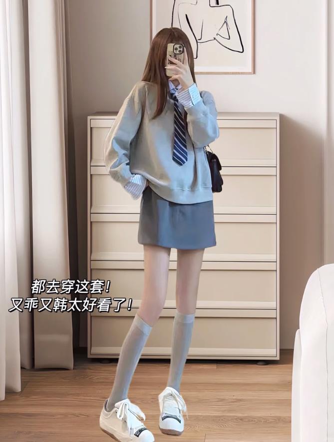 這一套韓系氛圍感學院風,我是真的好喜歡啊,藍灰配色真的非常顯高級,裙子版型偏直筒形狀,顯瘦又藏肉。