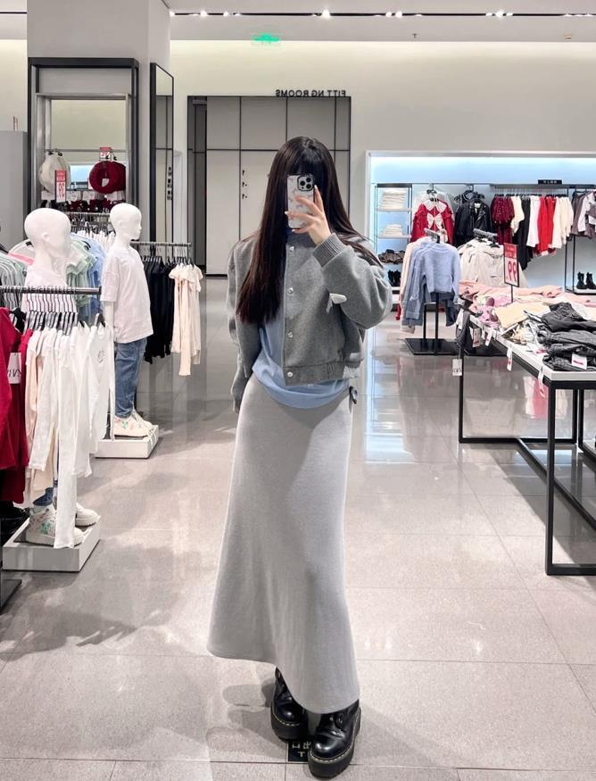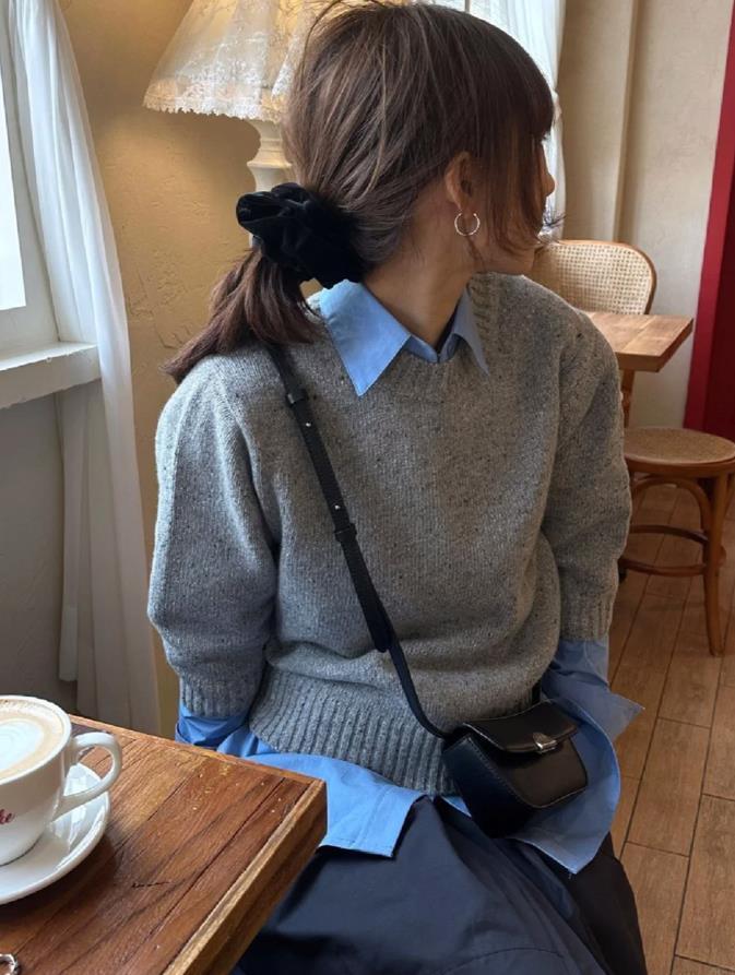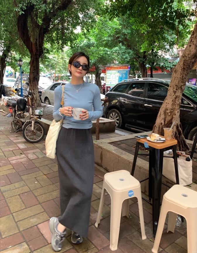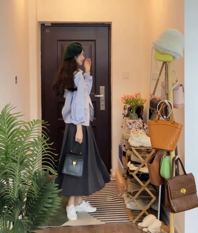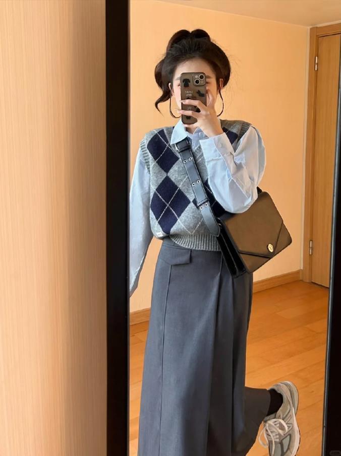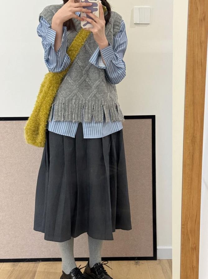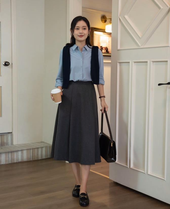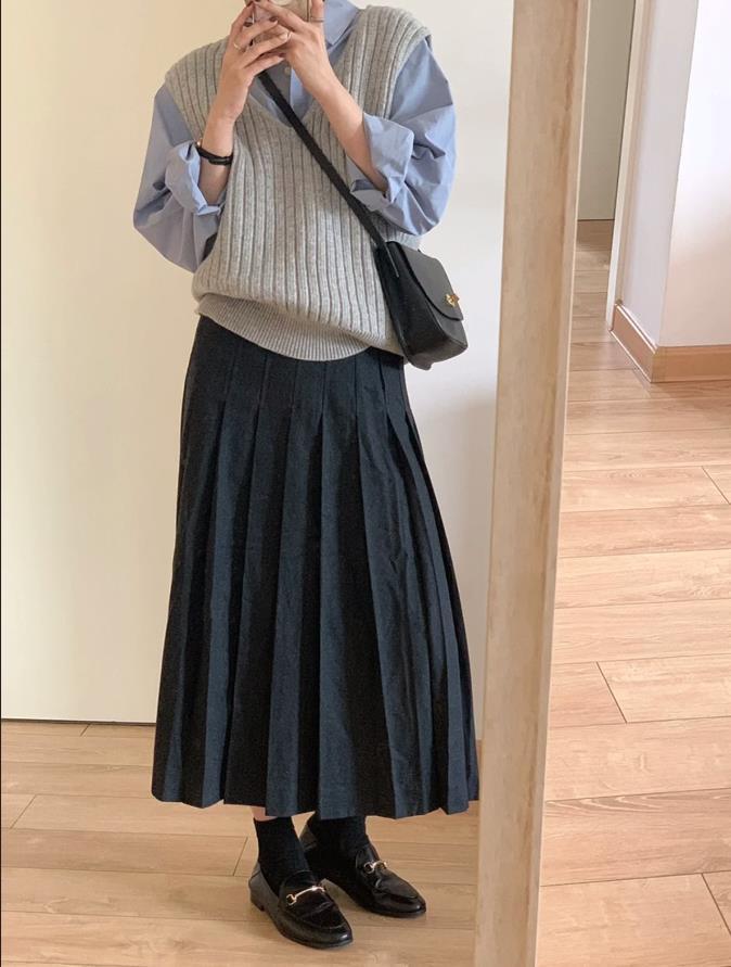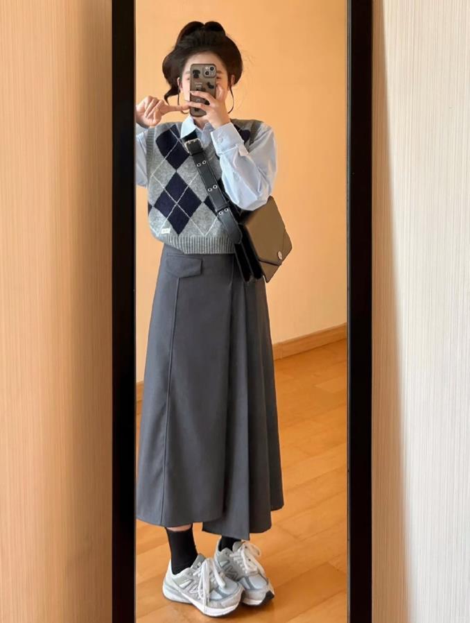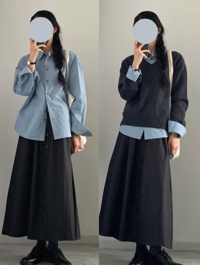 藍色襯衫+灰色毛衣,下身一條半身長裙,顏色與毛衣進行了呼應,和諧又高級。大大方方的一套,主打一個不費力!