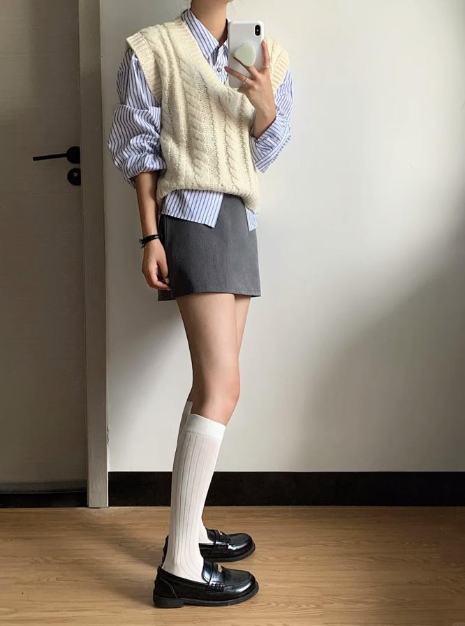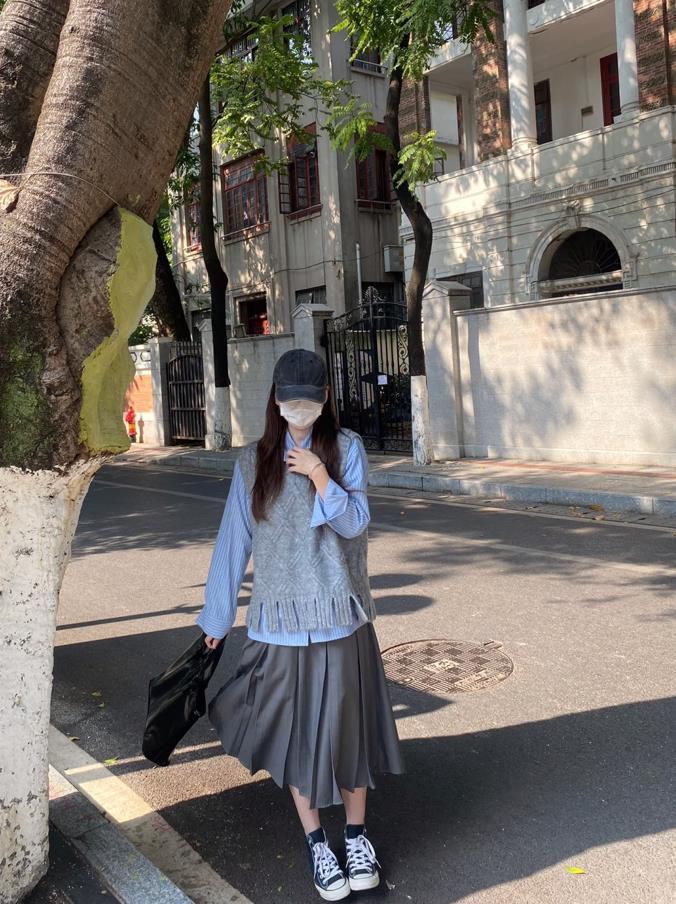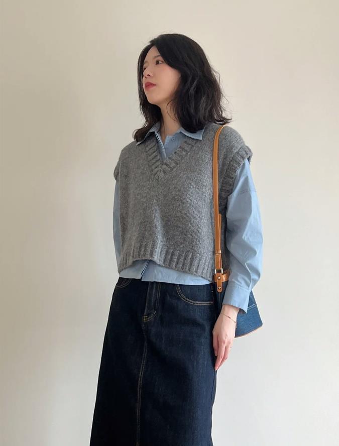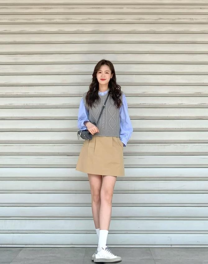 春天鹽系穿搭,喜歡這種風格的姐妹就學起來吧,藍襯衫+灰毛衣馬甲,下身是一條卡其色半裙,一整套都非常韓系,完全穿不膩。